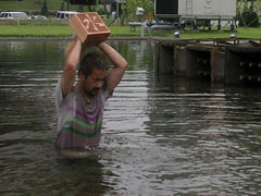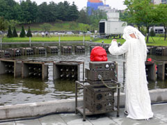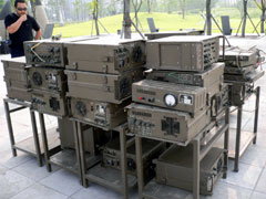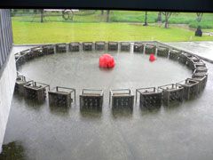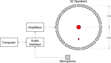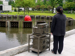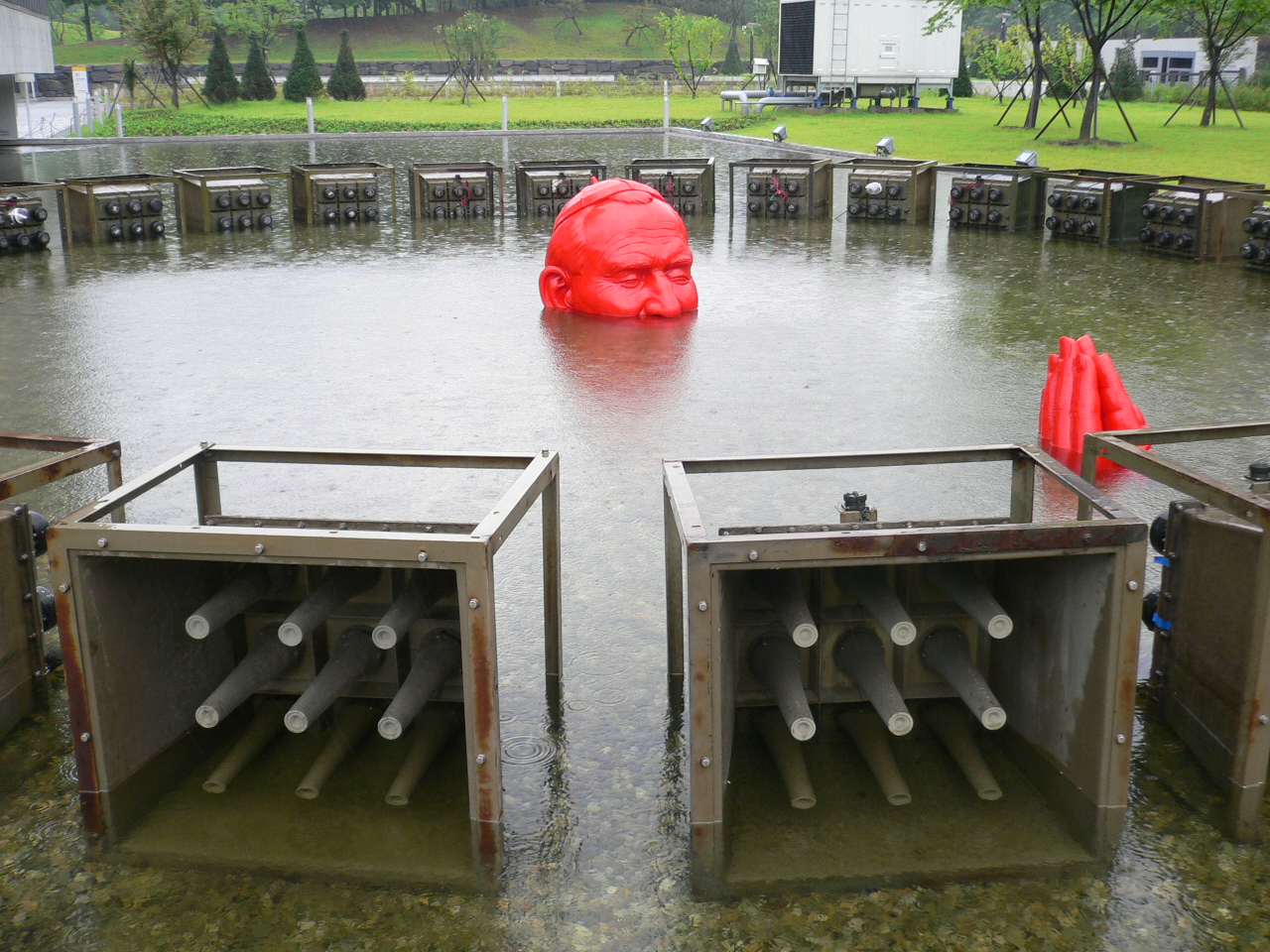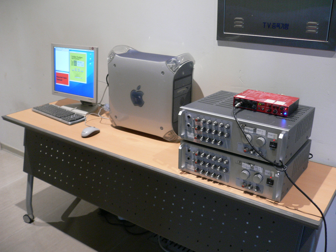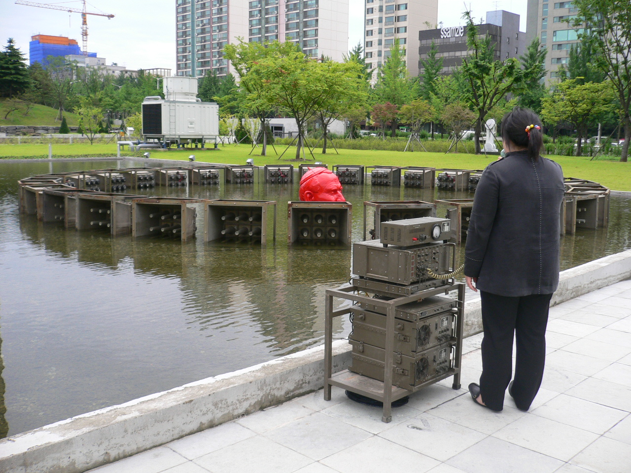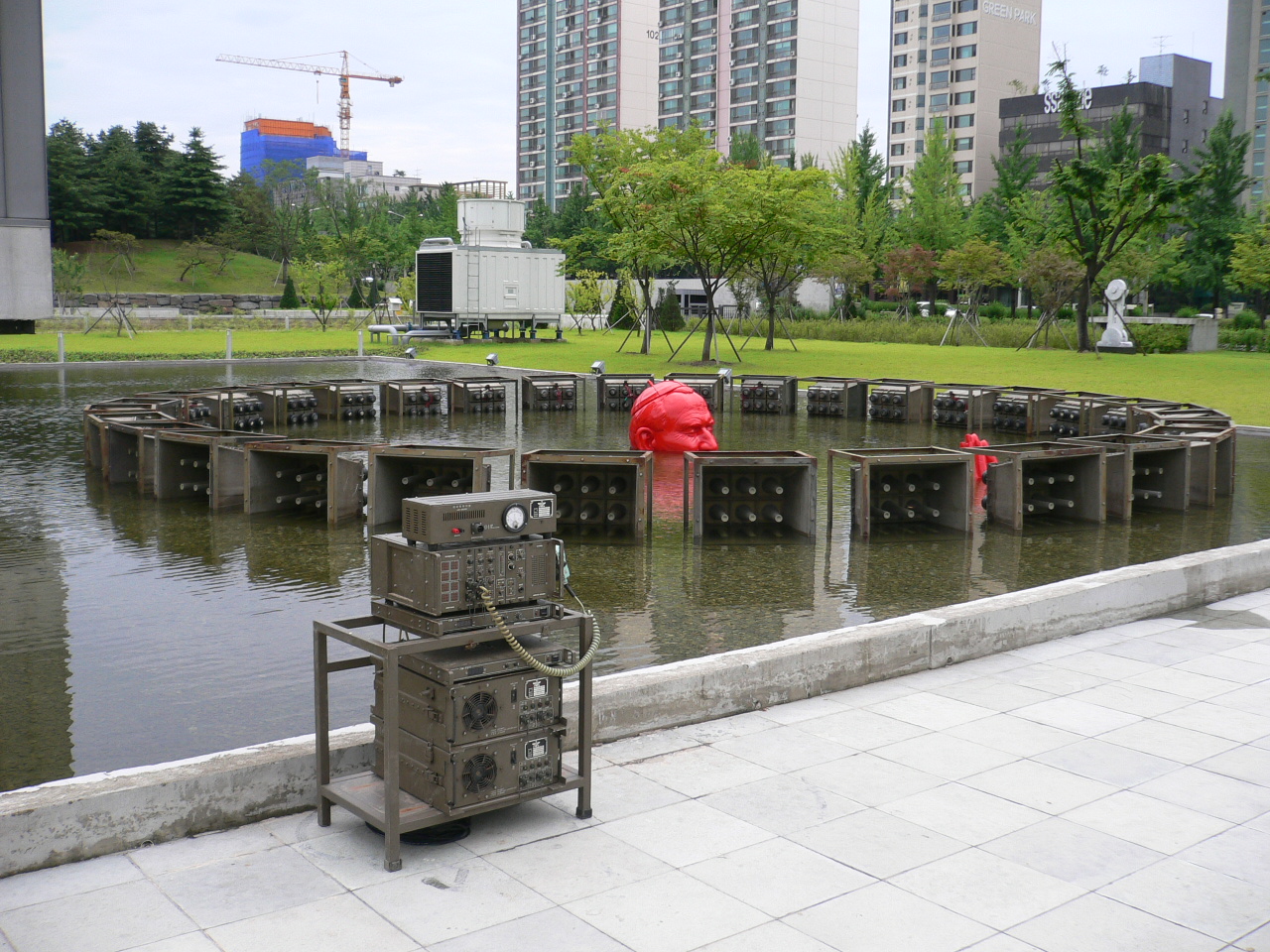 OutlineGolden Numbers is a sound installation that uses the gigantic speakers that were formerly used at the DMZ (demilitarized zone on the border between North and South Korea) for broadcasting propaganda. In this installation, the numbers from 0 to 36525 are read out. This number represents the number of days in the hundred years from August 15 1945 to August 15 2045. Further, recordings of old radio broadcasts and sounds produced in real-time from encoded signals are heard intermittently, and the audience can also use a microphone to broadcast their own voices through the speakers. All these sounds mingle slowly around a circle, resembling the movement of a clock’s hand or the orbit of a celestial body, and allude to the passage of time and history. The voices recorded into the microphone show that everyone lives within the flow of time, and contributes to history in some way. BackgroundOn August 15, 1945, the Japanese acceptance of the Potsdam Declaration freed Korea from Japanese occupation, but the country was divided into two at latitude 38 degrees north and ruled as trusteeships by the Soviet Union and US. Then, on June 25, 1950 the Korean War broke out, and after intense fighting, a ceasefire agreement was signed on July 27, 1953. At this time, a 4km-wide demilitarized zone (DMZ) was set up along the truce line, surrounded with barbed wire and high-pressure electric lines, littered with mines and monitored with a strong search light at night. An enormous quantity of gigantic speakers used to blare loud propaganda calling for people to defect, but these broadcasts were stopped in summer 2004 upon agreement of both sides, and the speakers were removed. The speakers, lights, barbed wire, fencing and other items removed from the DMZ were transported to Seoul and became the material for works being exhibited at the exhibition From the Fall of the Berlin Wall to DMZ. The theme of this exhibition is the fall of the Berlin Wall, which symbolized the end of the Cold War, and the DMZ, which is a symbol of North and South Korea, the last divided state. The exhibition displays paintings, sculptures, video, installations and other works created by several artists including Nam June Paik. DescriptionGolden Numbers is a sound installation consisting of 32 gigantic military speakers removed from the DMZ. Three types of sounds are broadcast from the speakers: numbers read out in Korean slowly and continuously; abstract, noise-like music interposed intermittently; and voices of the audience, spoken through the same microphones that were used by military personnel at the DMZ. The numbers read out start from 0 and continue until 36525. This number represents the number of days in the hundred years from August 15 1945 to August 15 2045. [Table of dates corresponding to number of days] Numbers are displayed as 5 digits prefaced by 0s, for example, 138 is displayed as 00138. Each digit of each number is read out in sequence from first to last with approximately one-second intervals between digits and approximately three seconds of silence at the end of each number. Thus, a new number is read out approximately every eight seconds, so it takes about 81 hours (three days, nine hours) to read 36526 numbers. However the time intervals for reading the numbers are not regular and change slightly. After all numbers are read out, the process repeats itself, starting from 0 again. The voices used for reading out the numbers are the voices of several Koreans recorded in Korea. The same person reads one series of digits, but each time the number of days change, a different person’s voice is randomly chosen. The numbers in Korean are spoken as follows, for example 00138 is read as yung, yung, il, sam, pal. 0 ... yung The numbers are read out constantly at a regular speed, but occasionally abstract, noise-like sounds creep in intermittently. These sounds are produced in real-time using sound files of over 200MB, composed of tones such as old radio broadcasts, Morse codes, sirens and so on. Since these sounds have undergone intense modulation and fragmentation and have been re-synthesized, it is impossible for listeners to pick out the original sounds, but they create a certain aura. While listening to the various sounds played from the speakers, the audience themselves may sound their voice from the speakers by using a microphone set up near the speakers. The microphone, also used at the DMZ, is operated by speaking into it while pressing the side button. In addition to the audience’s voices being amplified from the speakers, they are gradually broken up and repeated giving an echo effect before fading out. Further, after fading out, the voices will suddenly reappear, affecting the other sounds. The 32 speakers are uniformly placed in an 11m-diameter ring, forming a perfect circle. All of the sounds move in a clockwise pattern, some fast and some slowly, around the ring of speakers, and each of the sounds have their particular position and speed. Therefore, the audience feels as though the various sounds are running in orbital motion, some sounds chasing and passing others. However, of these 32 speakers, only eight equidistant speakers are used to play sound at any given time. Further, each speaker consists of nine driver units, of which only one is used. Even with only one unit, the amplifying power is so great that the amp volume must be muted. This should give an idea of the mega-volumes at which propaganda was played. ConfigurationThe following equipment was used to create Golden Numbers: