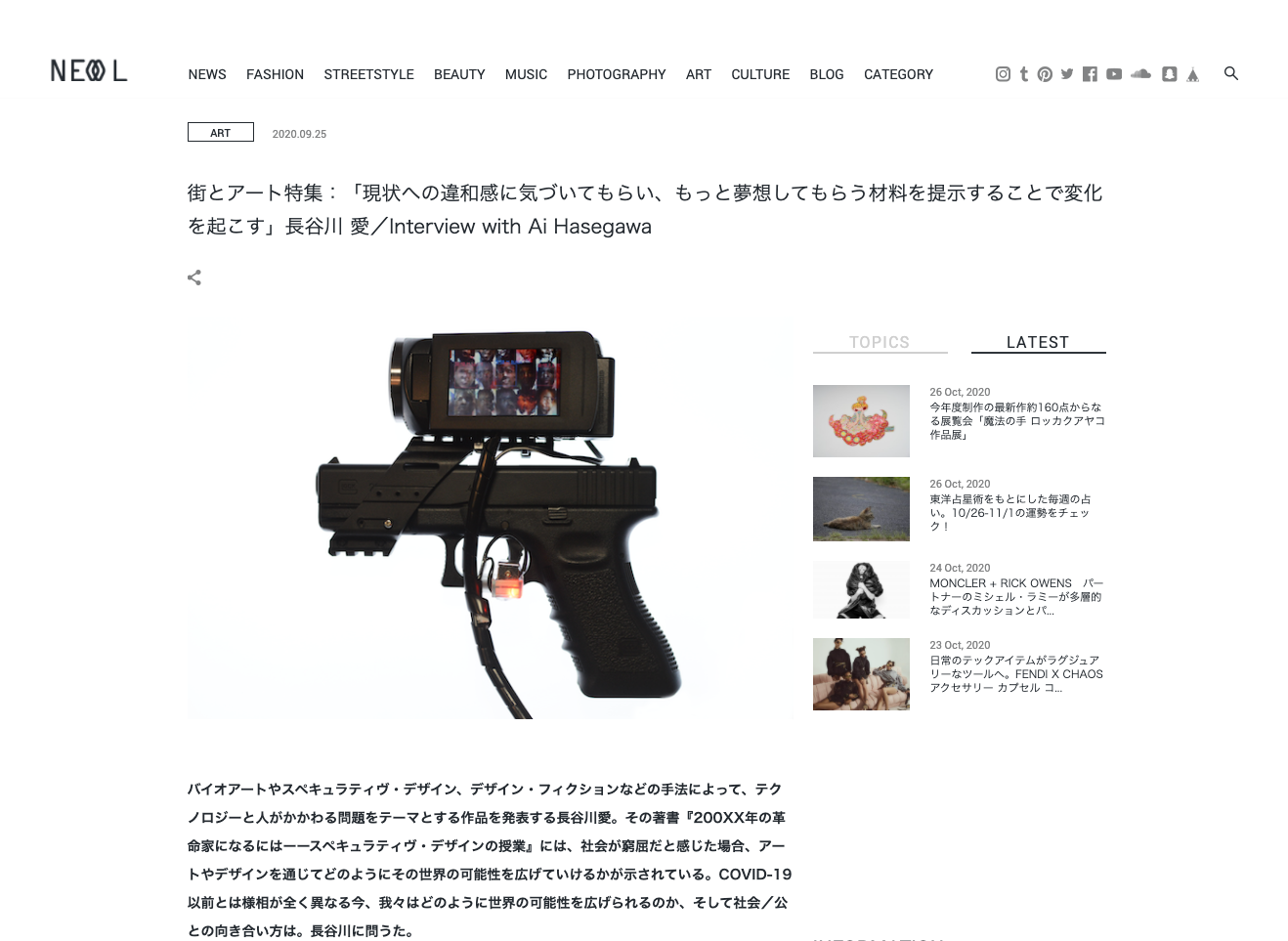 クリエイティブ・ソースを探求するインターネット・マガジン「NeoL Magazine」に卒業生の長谷川愛さんのインタビュー『「現状への違和感に気づいてもらい、もっと夢想してもらう材料を提示することで変化を起こす」長谷川 愛/Interview with Ai Hasegawa』が掲載されています。