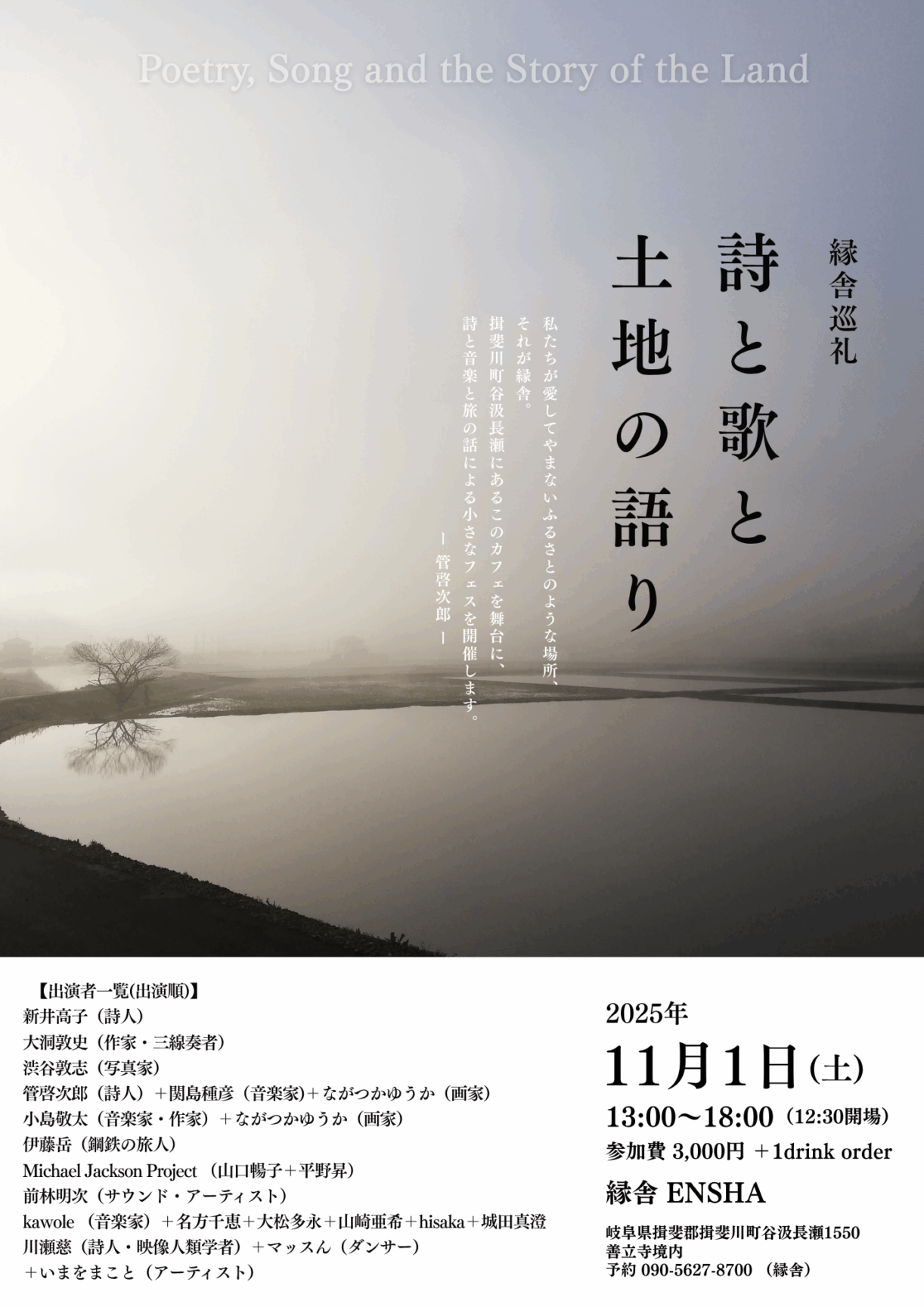 2025年11月1日に縁舎(岐阜県揖斐川町)で、縁舎巡礼「詩と歌と土地の語り」が開催されます。このイベントに前林明次教授が出演します。前林教授は、映画『惑星ソラリス』の1シーンをモチーフとして、さまざまな「自然」の音をコンピューターでコラージュし、ライブ演奏を行います。
