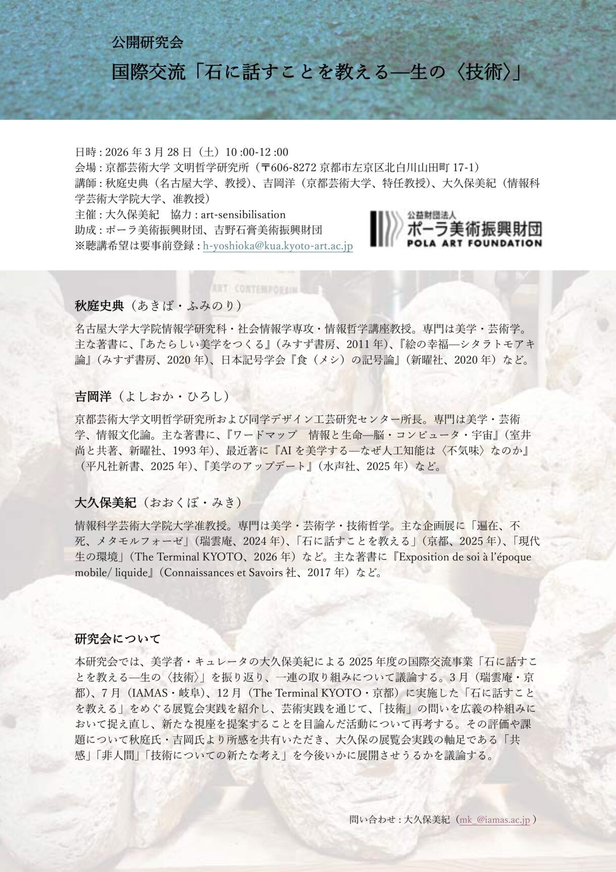 2026年3⽉28⽇に京都芸術⼤学 ⽂明哲学研究所で、大久保美紀准教授主催の公開研究会「⽯に話すことを教える-⽣の〈技術〉」 が開催されます。