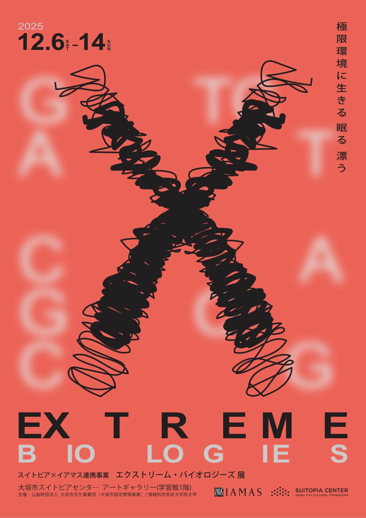 2025年12月6日から14日まで大垣市スイトピアセンター アートギャラリーにて、スイトピア×イアマス連携事業「エクストリーム・バイオロジーズ展 ― 極限環境で生きる、眠る、漂う」が開催されます。本展は本学のプロジェクト活動であるエクストリーム・バイオロジーズについての研究活動の紹介、作品制作、ワークショップの記録などを展示します。