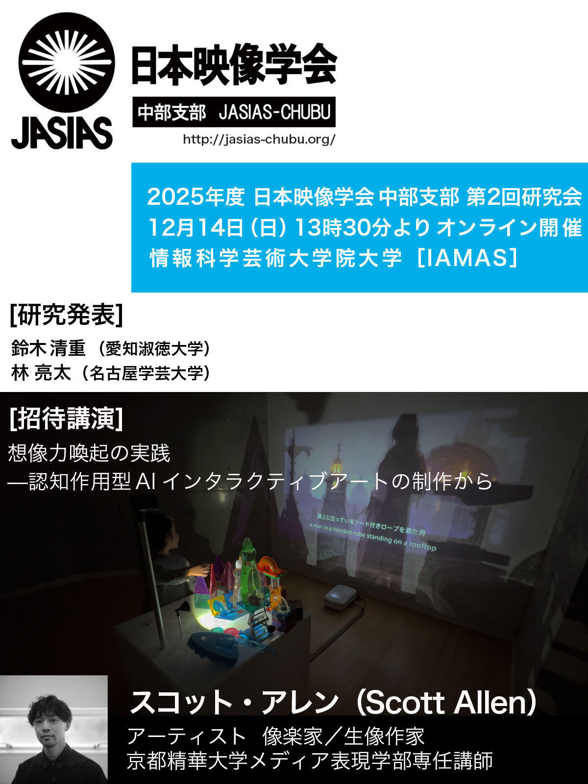 2025年12月14日に日本映像学会中部支部 第2回研究会がオンラインで開催されます。会員による2件の研究発表と招待講演です。今回は本学がホスト校となり、モデレーターを前田真二郎教授(日本映像学会中部支部幹事)が担当します。また招待講演では、本学卒業生のScott Allenさんが登壇し、「認知作用型AIインタラクティブアート」に関する近年の取り組みと最新の実践について紹介します。
