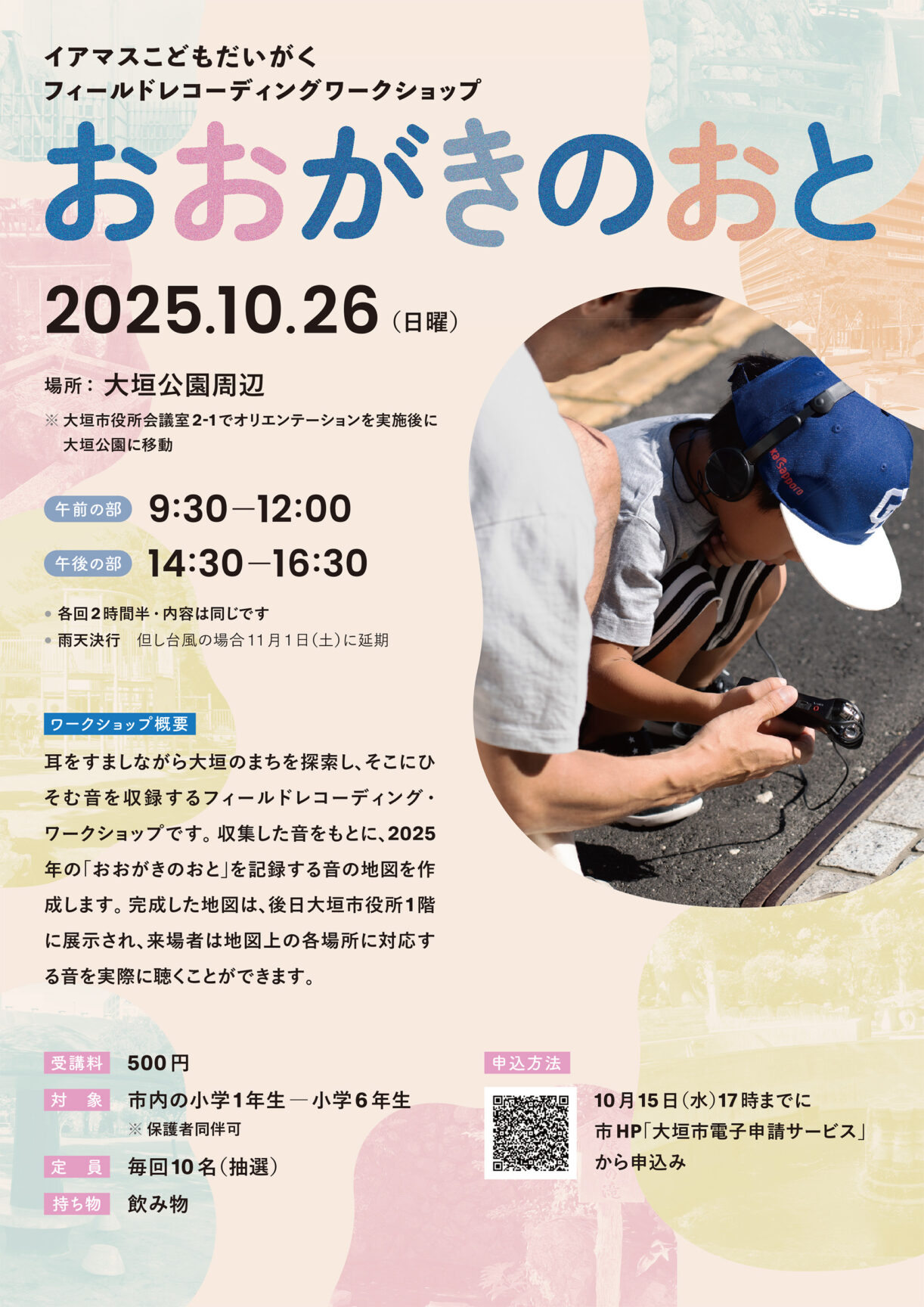 2025年10月26日に「イアマスこどもだいがく」を開催します。今回は、卒業生で音響作家のウエヤマトモコさんを講師に迎え、大垣市を対象としたフィールドレコーディングワークショップが行われます。