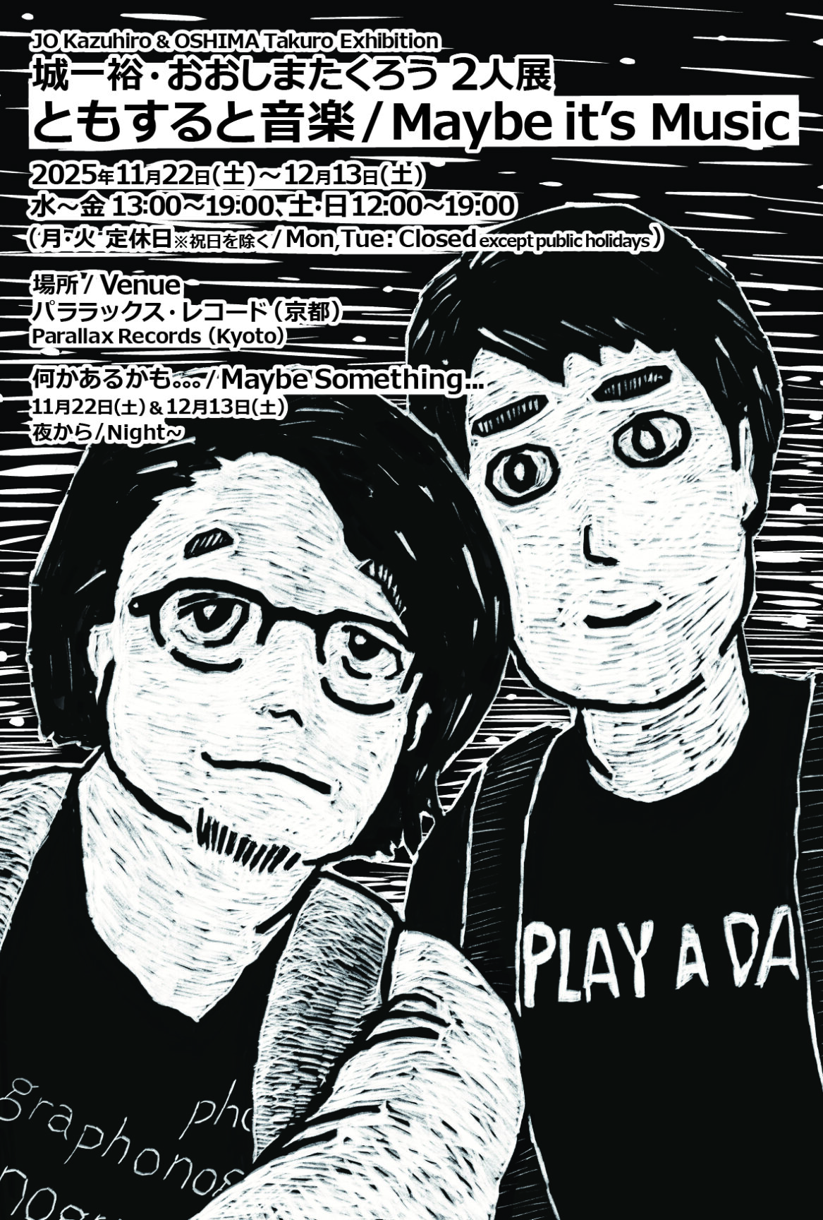 2025年11月22日から12月13日まで、京都・パララックス・レコードで、城一裕さんと卒業生のおおしまたくろうさん 2人展「ともすると音楽 / Maybe it’s Music」が開催されます。音響学を背景にメディア技術へ批評的に向き合う城一裕さんと、身近な道具を楽器に改造するおおしまたくろうさんによる、音の装置をめぐる展示です。