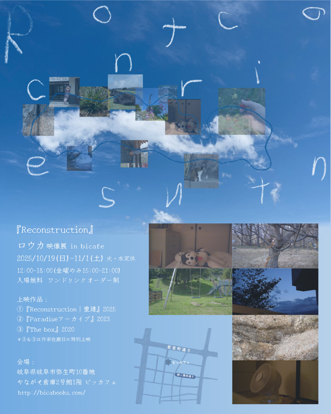 2025年10月19日から11月1日まで、岐阜市・ビッカフェにて、卒業生の路雨嘉さんの個展『Reconstruction』ロウカ 映像展が開催されます。今回の展覧会では、新作の映像散文詩『Reconstruction|重建』のほか、修士作品『Paradise』のアーカイブ映像などが展示上映されます。