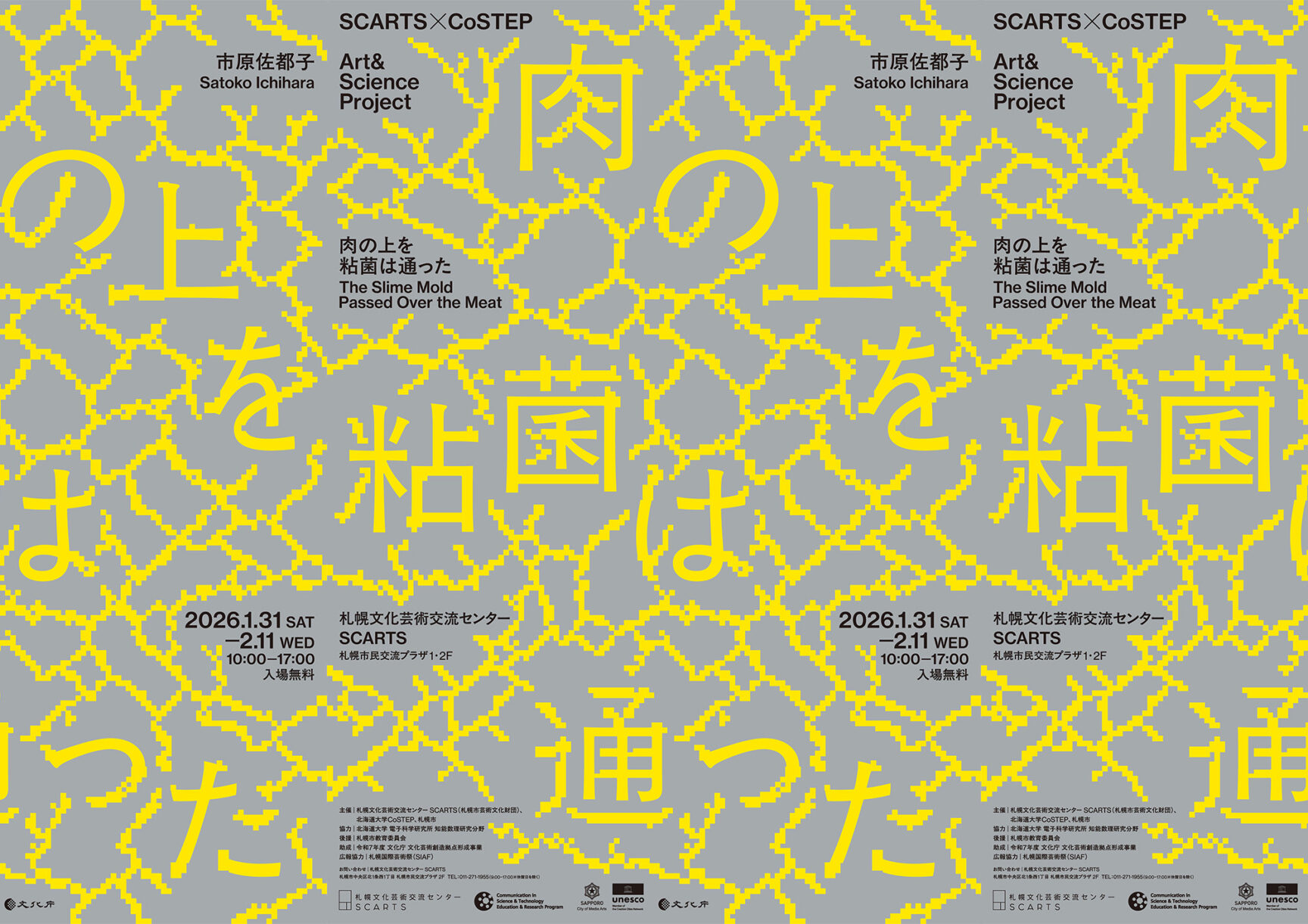 2026年1月31日から2月11日まで札幌文化芸術交流センター SCARTSで、SCARTS×CoSTEPアート&サイエンスプロジェクト 市原佐都子『肉の上を粘菌は通った』が開催されます。札幌文化芸術交流センター SCARTSと北海道大学CoSTEPが共同し、若い世代のアートとサイエンスに対する探究心や感性を養うことを目的としたプロジェクトで、今年度は招聘アーティストに市原佐都子さんを迎え、成果発表として展覧会が開催されます。
