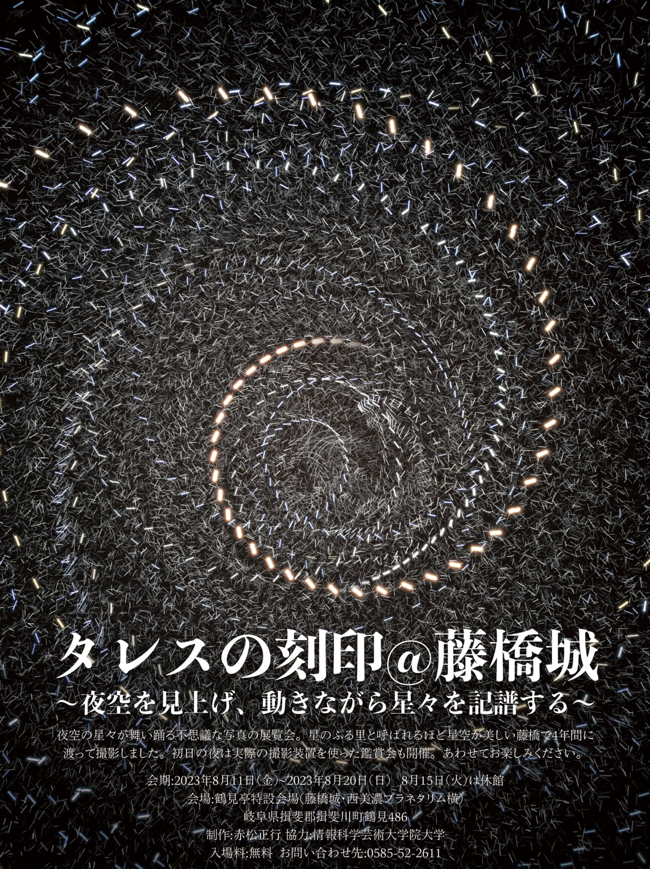 2023年8月11日から8月20日まで、岐阜県揖斐川町で赤松正行教授の展覧会「タレスの刻印@藤橋城」が開催されます。揖斐川町の星空を特殊な撮影装置を使って長時間露光によって撮影、今回は半透明のアクリル・パネルに印刷した写真を自然光のもとで展示されます。