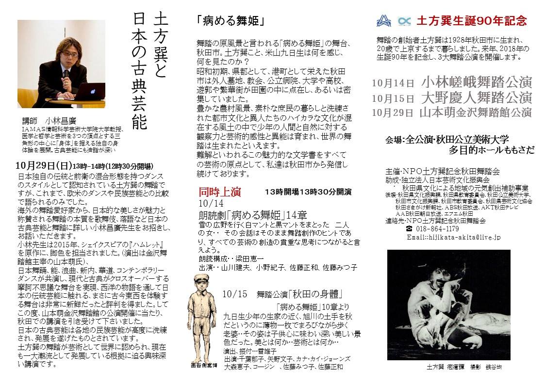 2018年 舞踏家・土方巽の生誕90周年を記念して土方巽に縁の深かったダンサーたちによる連続公演が、秋田公立美術大学多目的ホールももさだで開催されます。