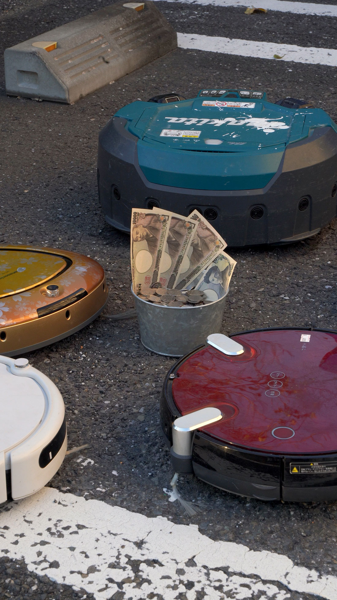 菅野:お掃除機ロボットは、唯一家電になったロボットなんです。ロボットメーカー、家電メーカーだけでなく、おもちゃ会社など多種多様な企業が参入しているので、種類が豊富にあります。なおかつ、発売されてから20年以上経っていて、人々の生活にかなり浸透している。古いものや壊れたものがフリマサイトにたくさん出品されています。捨てられたお掃除ロボットが、野生化して自活し始め、5色集まって戦隊を組むという映像作品です。