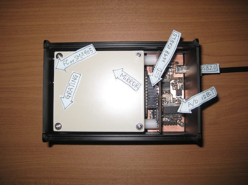 光源(自然光、LEDなど)からの光を回折格子によって分光し、ラインセンサによって光強度を測定します。波長が既知の基準光を利用することで、ピクセル番号と波長の関係を決定し、分光器として利用しています。ラインセンサの駆動基板のみの利用も可能です。
