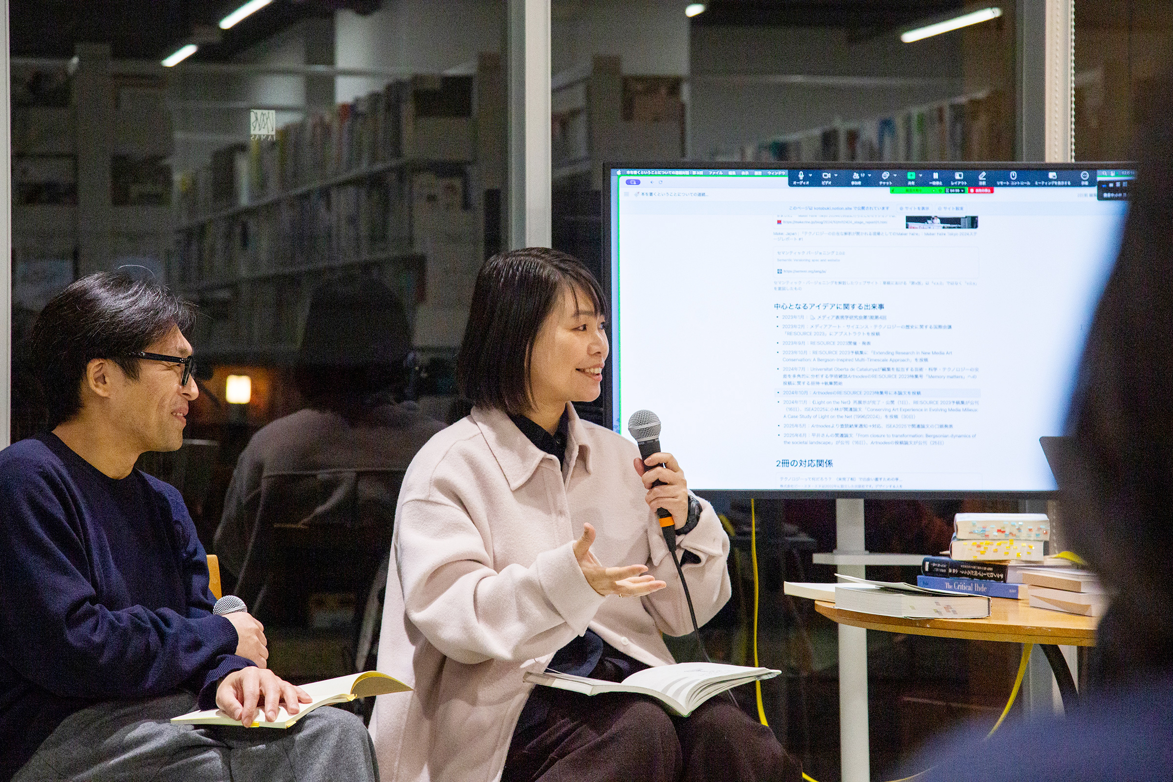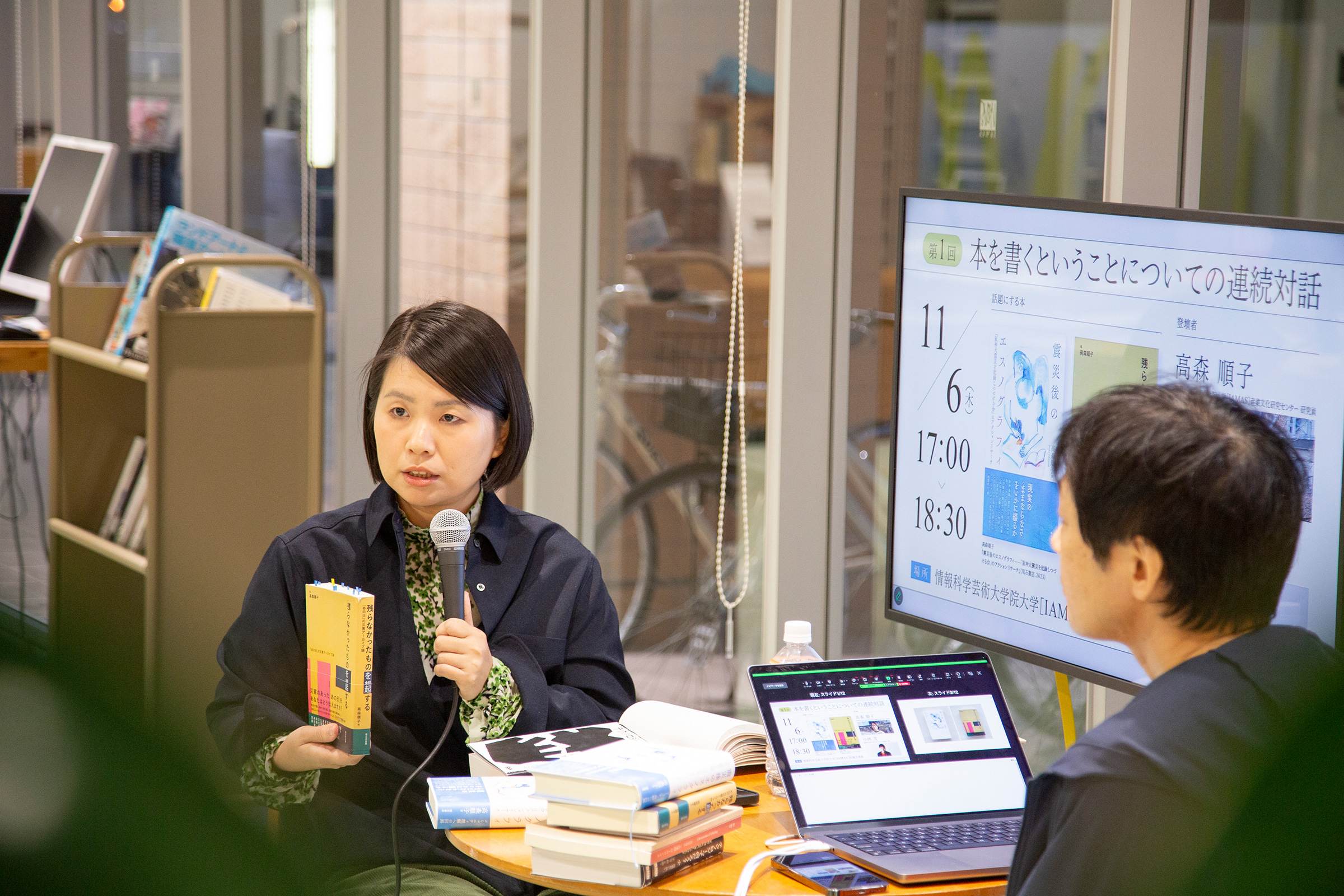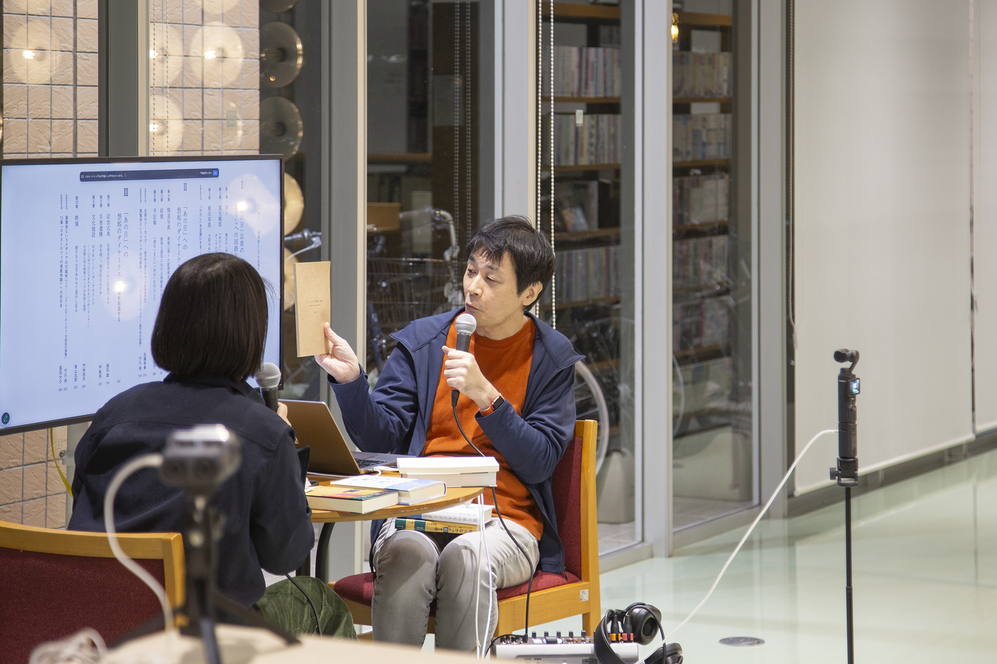 第1回(2025年11月6日)は、本学産業文化研究センター研究員の高森順子さんと、単著『震災後のエスノグラフィ——「阪神大震災を記録しつづける会」のアクションリサーチ』(明石書店、2023)および編著『残らなかったものを想起する——「あの日」の災害アーカイブ論』(堀之内出版、2024)を話題に話しました。高森さんは、グループ・ダイナミックスの視点から、災害体験の記録や表現をテーマに、アクションリサーチを方法論として取り組んでいる研究者です。『震災後のエスノグラフィ』はいわゆる「博論本」と呼ばれる博士論文を基にした本です。学位請求のために提出される博士論文と一般向けに出版される本では構成や内容が大きく異なることが多いのですが、この本の場合にも大幅に再構成されています。対話の中では、本になっていく過程について詳細に伺うことができました。高森さんは単著または共著として本を書くことによって可能になる展開があることを強調されました。これは、刊行は終着点ではなく、本を書いていることによってそこから始まる展開があるということでもあります。