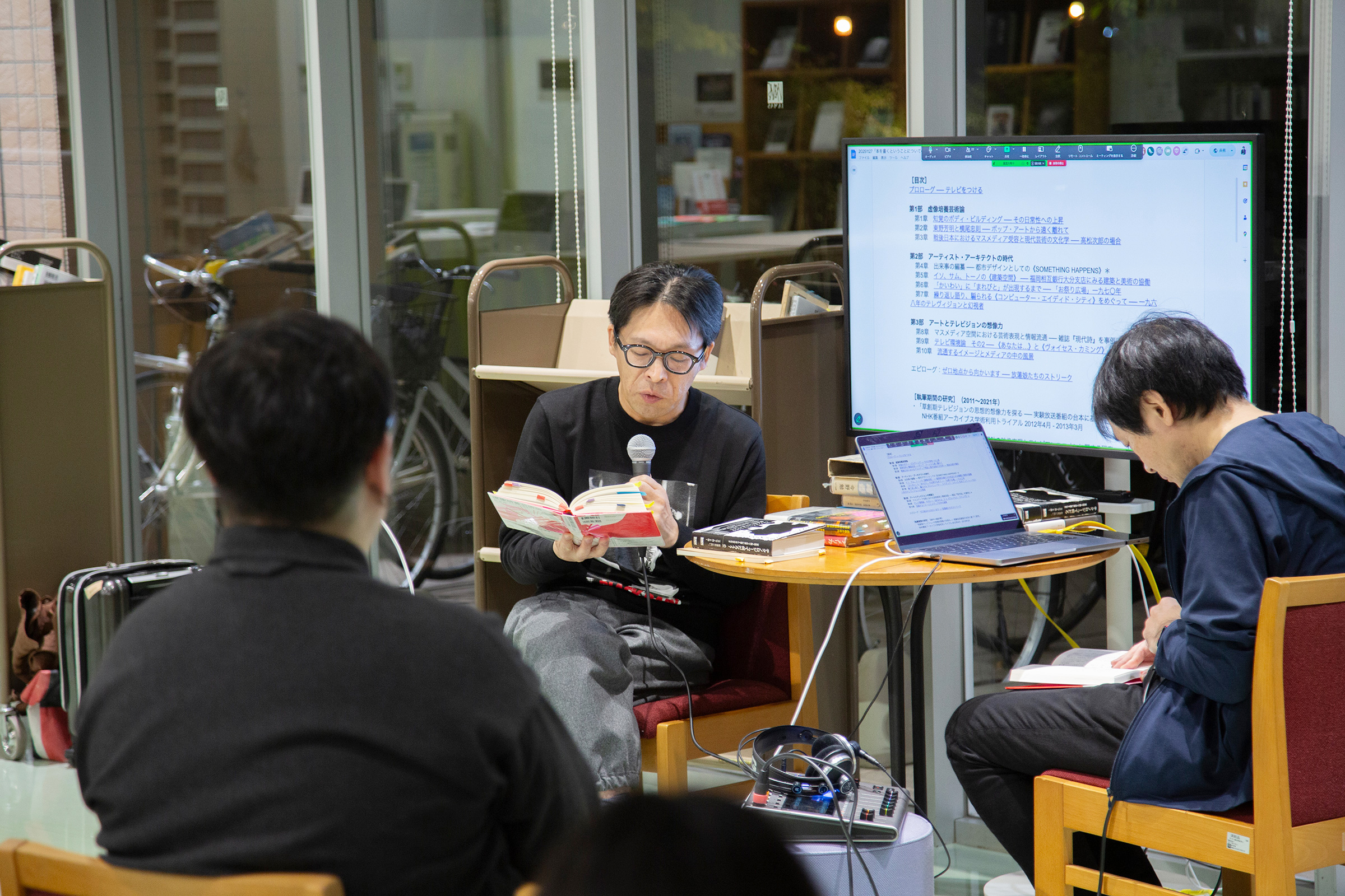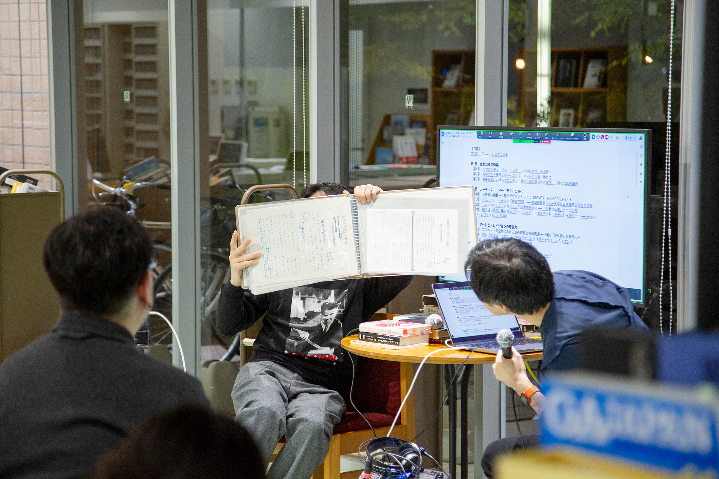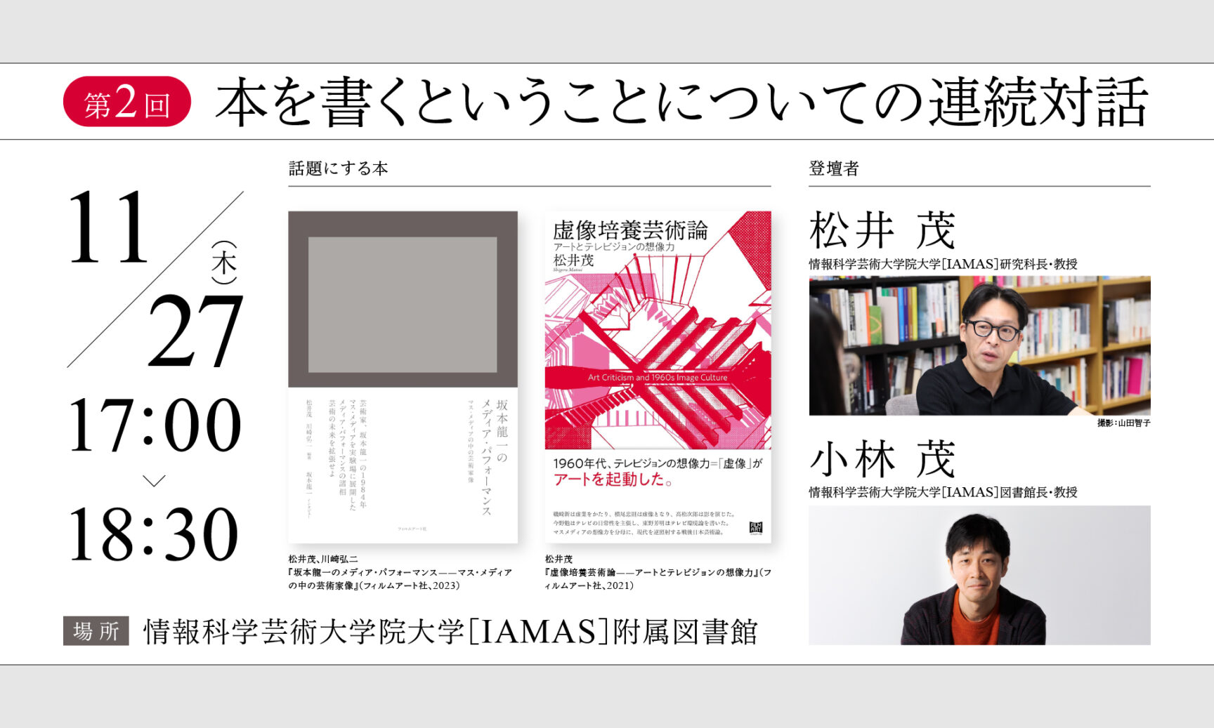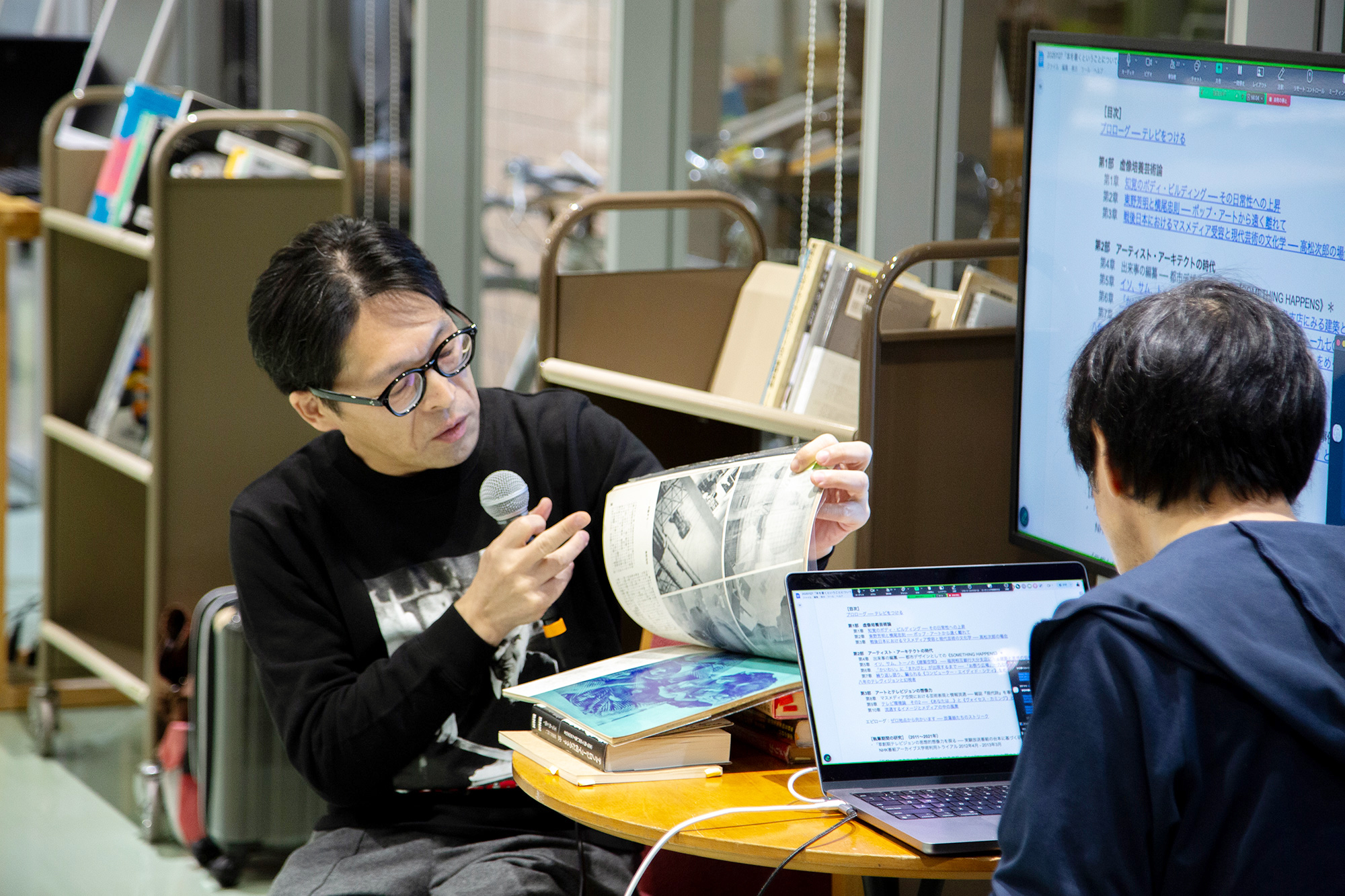 第2回(2025年11月27日)は、研究科長・教授・前図書館長の松井茂さんと、単著『虚像培養芸術論——アートとテレビジョンの想像力』(フィルムアート社、2021)、川崎弘二さんとの共著『坂本龍一のメディア・パフォーマンス——マス・メディアの中の芸術家像』(フィルムアート社、2023)を話題に話しました。松井さんは、詩人としての活動に加えてアーカイバル・リサーチの研究者としても活躍され、直近では水戸芸術館での展覧会「磯崎新:群島としての建築」でゲストキュレーターを担当していらっしゃいます。『虚像培養芸術論』は松井さんがそれまでに書いてきた論考を再構成しつつプロローグで著者自身による解題が提示されるという構成になっています。対話において、例えば第一部「虚像培養芸術論」では美術評論家の東野芳明による著書『アメリカ「虚像培養国誌」』(美術出版社、1968)の面白さを伝えたいなど、それぞれの部分に関してどのような動機があったのかが語られました。本を書くという行為に至るからには何らかの動機があるわけですが、完成した本を外から眺めるだけでは見えないことでもあります。そうした時間的内部について伺えたことで、既にこれらの本を読み終えていた私にとっても、見え方が変わってくるような発見が幾つもありました。