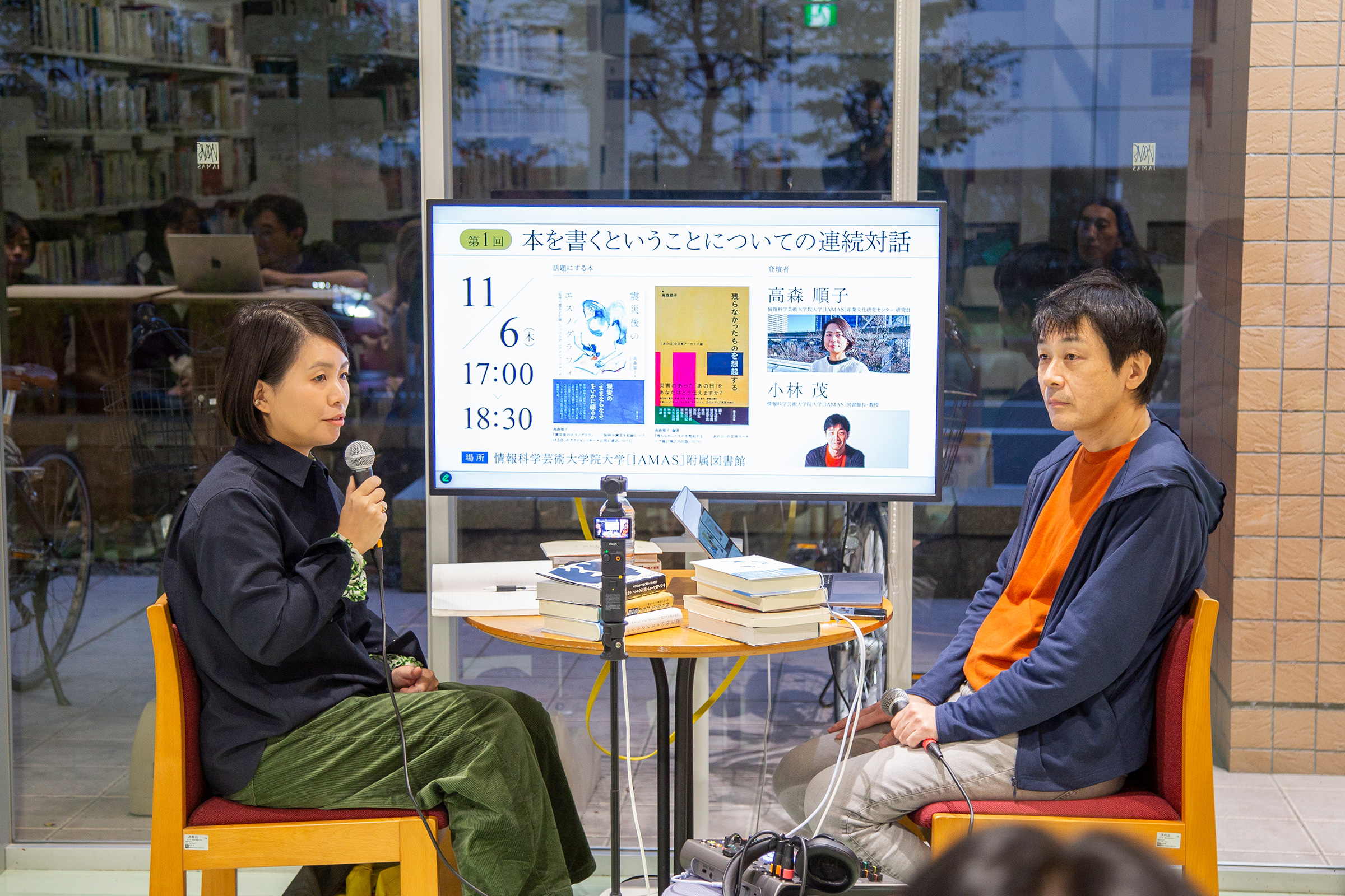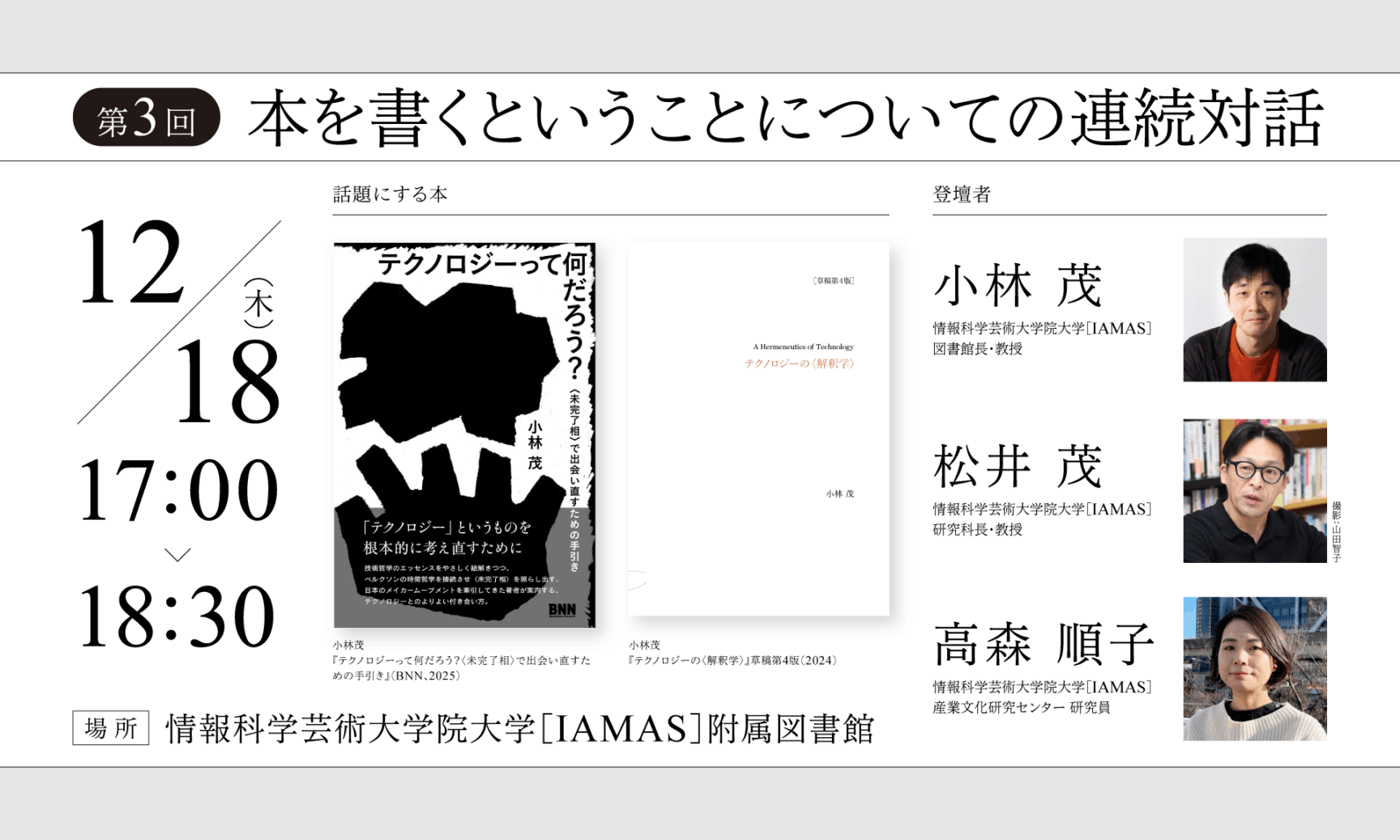 新任の図書館長として、何か本に関わる企画をやってみようと思い始めたのは、2025年9月に自身の著書『テクノロジーって何だろう?』の刊行を終えた直後でした。一般書であれ学術書であれ、本として長い文章を書くという経験は、論文を書くのとはまた大きく異なります。本を書くのは楽しくも苦しくもある大変貴重なものなのですが、経験する機会は限られています。本学には、単著や共著で本を刊行されている教職員がいらっしゃいます。であれば、そうした方々との対話を通じて、本を書くという行為の時間的内部へと開くようなイベントができるのではないかと考え、ひとまず2回からなる企画を立てました。