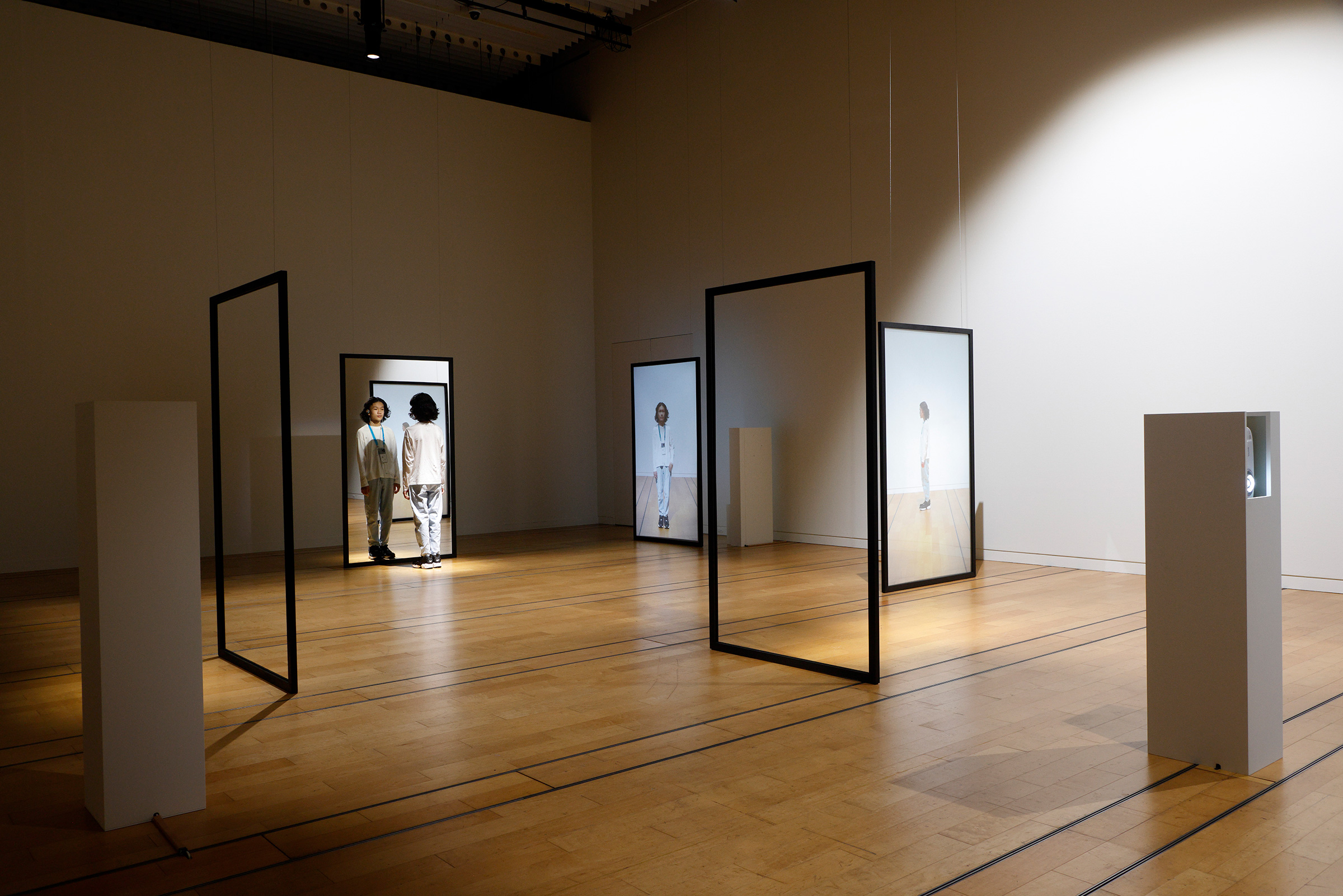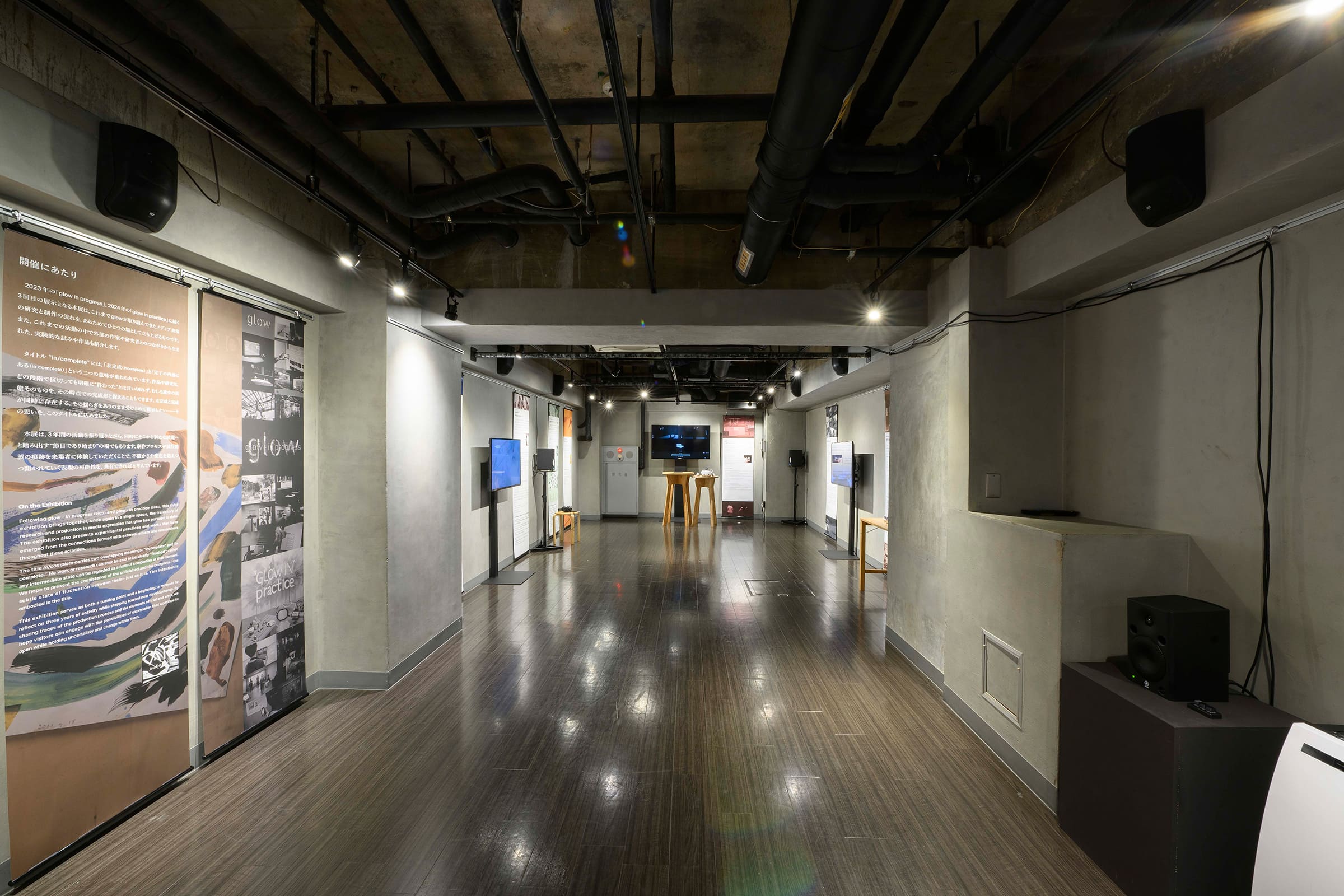 今回の「glow in/complete」展は、2023年の「glow – in progress」、24年の「glow – in practice」に続く、glowとしては3回目の展示である。企画代表の赤羽の展覧会ステートメントによれば、これまで彼らが取り組んできたメディア表現の研究と制作の流れを、あらためてひとつの場として立ち上げるものだという。それぞれのプロジェクトで設定された目的に応じて、ARAGをはじめとする様々な技術が組み合わされて、体験型の展示が展開されていた。一見バラバラなようで、多くが技術的な面ではXRをベースとしたインタラクティブ表現となっていたり、あるいは「時空間」「現象」「曖昧な認識」など捉えづらい対象への強い興味を共有しているように見えた。