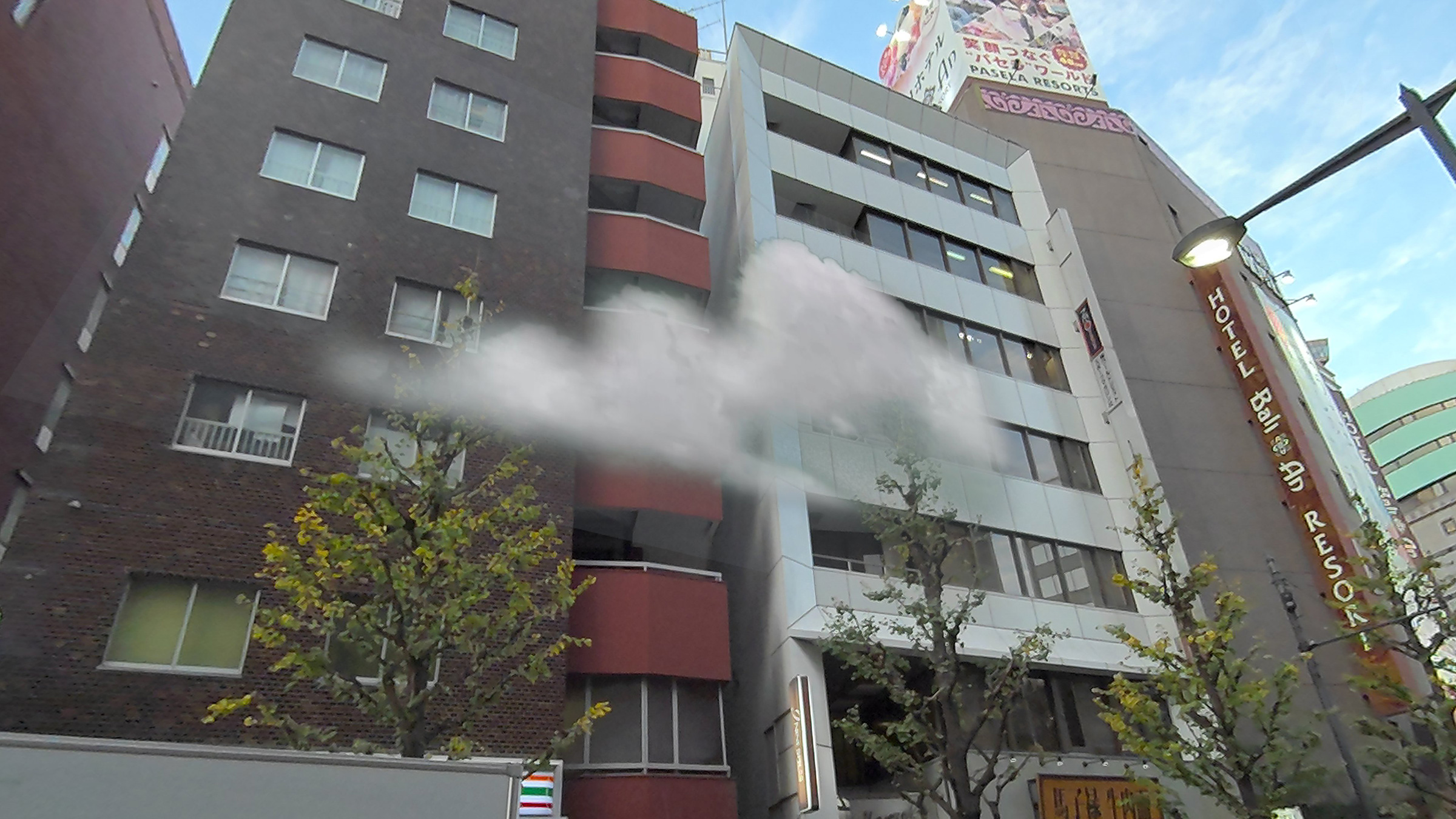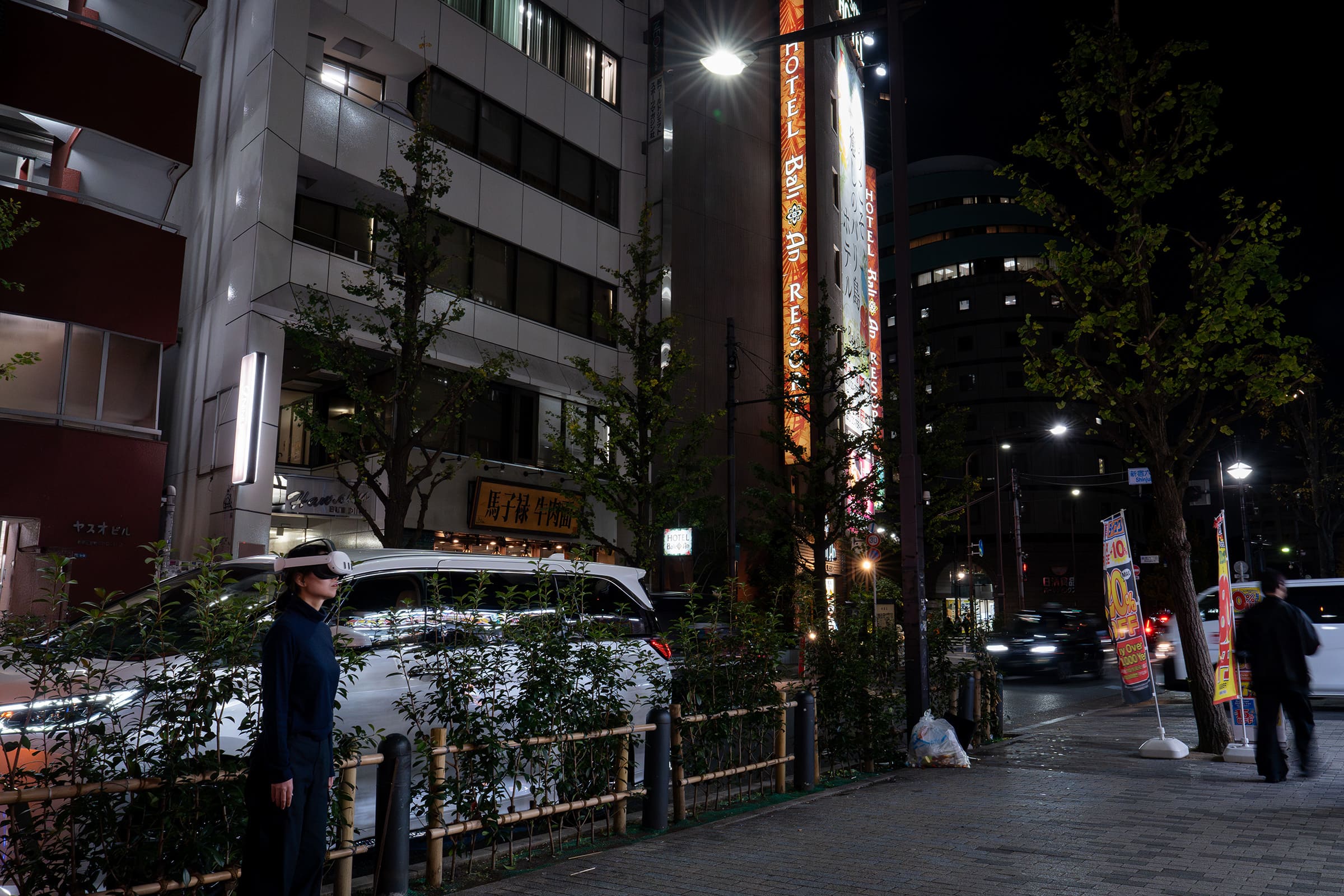 《都市の皮膜》はこの「MCMR」を用いて制作されたVR作品だ。本作で鑑賞者はヘッドマウント・ディスプレイを被り、街に出る。会場となった新宿眼科画廊は、歌舞伎町に隣接する新宿5丁目であり、作家である小此木の解説にある通り「とても雑多で、混沌としており、街全体の情報量が非常に多い」という印象を受けるエリアであるが、VRゴーグル越しに見るその風景の中に仮想の映像作品が9点、配置されている。筆者もヘッドマウント・ディスプレイをつけて会場の外を歩いたが、夜景の映像で塗りつぶされた長方形やグラフィティのような形状など、明らかに現実とは違うものもあれば、突然目の前に現れる雲、鳥か虫のような群など、背景と馴染むような微妙なイメージまであった。「背景に馴染む」と書いたが、意外にも雑然とした新宿5丁目の中でも現実とは区別ができ、現実に重ねられる映像の立体感や明るさが絶妙なバランスに調整されていたようである。思えばこれまで体験したVR作品では視界全体が作品世界になっていて、鑑賞者の視野や動ける範囲は限られており、本作のように現実空間を自由に移動しながら鑑賞することが重視されるものを初めて見た。(これまで見たものはギャラリースペースで体験するものだったので、ここに挙げている体験中の写真のように雑然とした都市空間の中でVRゴーグルをつけている写真も、あまり見たことがない。)