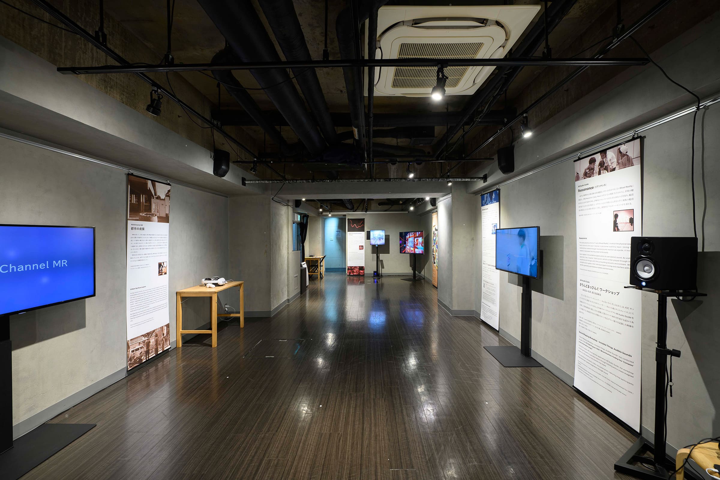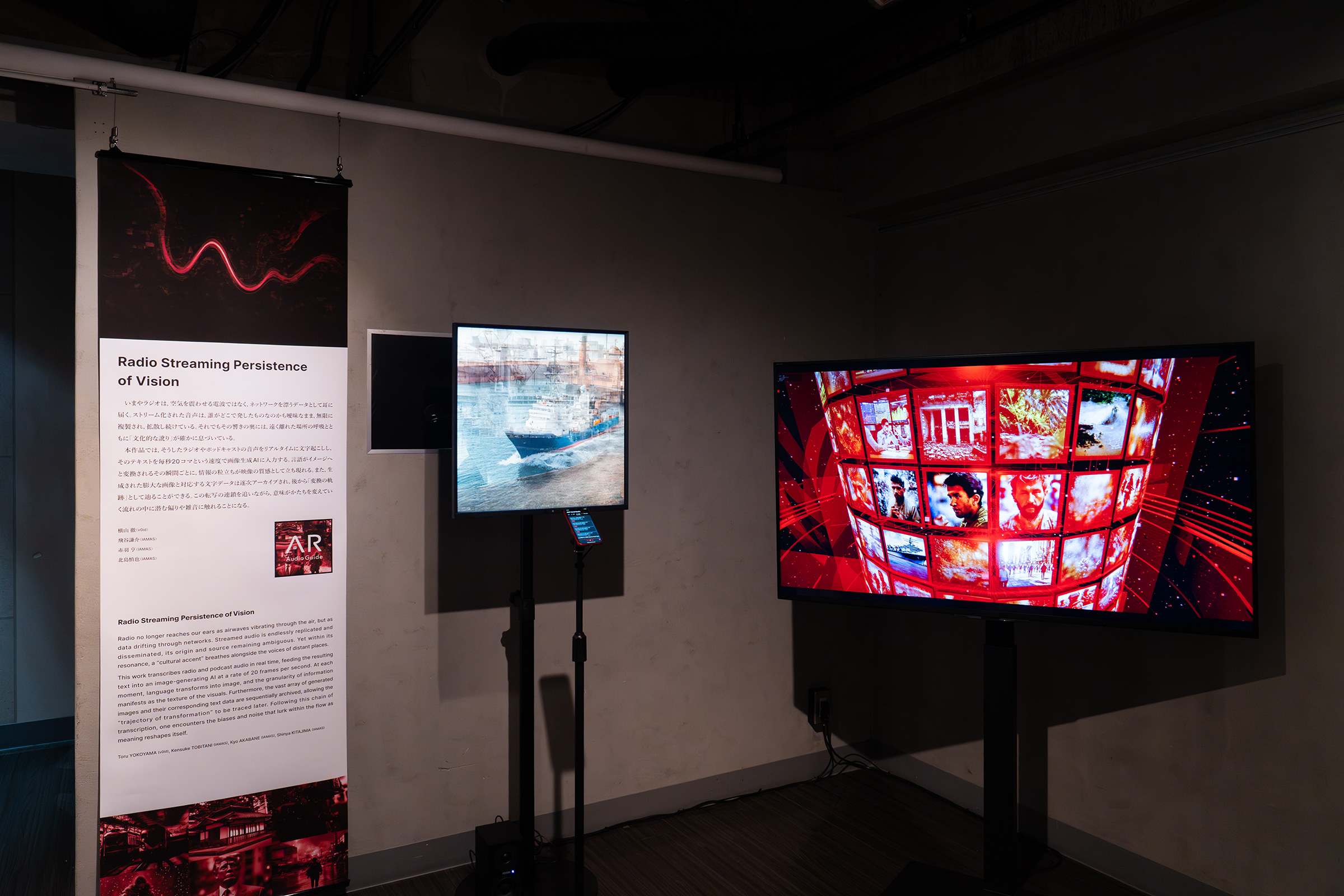 実際の体験としても、正直なところ想定外のものだった。というのも会場となった眼科画廊スペース地下は、決して広い展示空間ではない。幅4.2×奥行き12.5m程度、天井高が3m程度の、ビルの一室だ。筆者は会場を知っていたので、訪ねる前は、どのようにしてこの数の作品や資料を展示するのか、個々の展示物の規模がかなり小さいのか、などと疑問に思っていた。ギャラリー内には、モニター3台とレールから下がるバナーサイン、スマートフォンやヘッド・マウント・ディスプレイが、決して所狭しという感じはなく展示されており、たしかに個々の展示物が占有する空間は大きくなかった。しかし勿論、それは展示として内容が充実していないということを意味しない。むしろかなり情報量が多く、スペースの規模から予想されるよりも長時間滞在した。