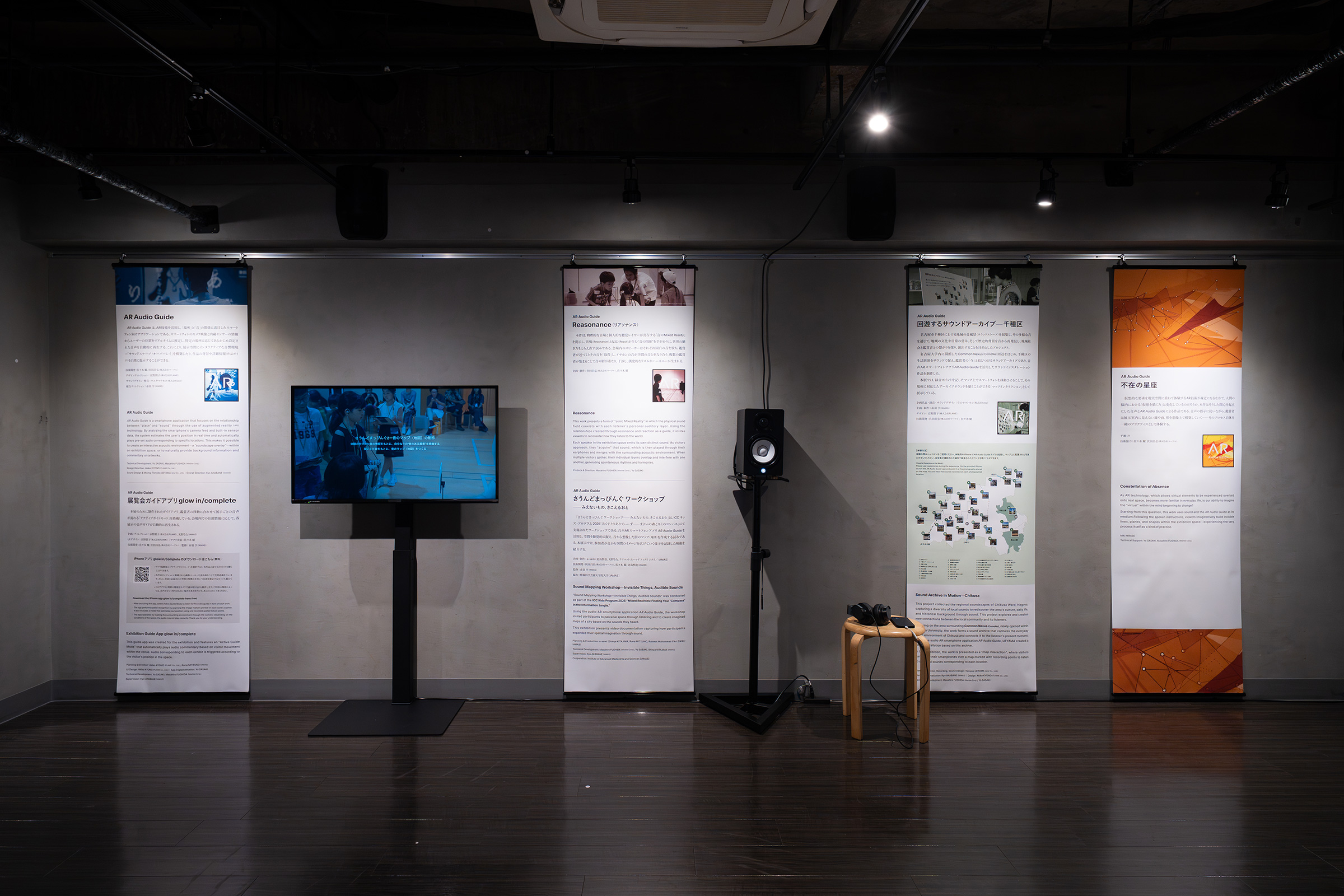 「glow in/complete」展会場風景。左からARAG解説、《さうんどまっぴんぐワークショップ——みえないもの、きこえるおと》、《回遊するサウンドアーカイブ—千種区》、《不在の星座》 撮影:丸尾隆一