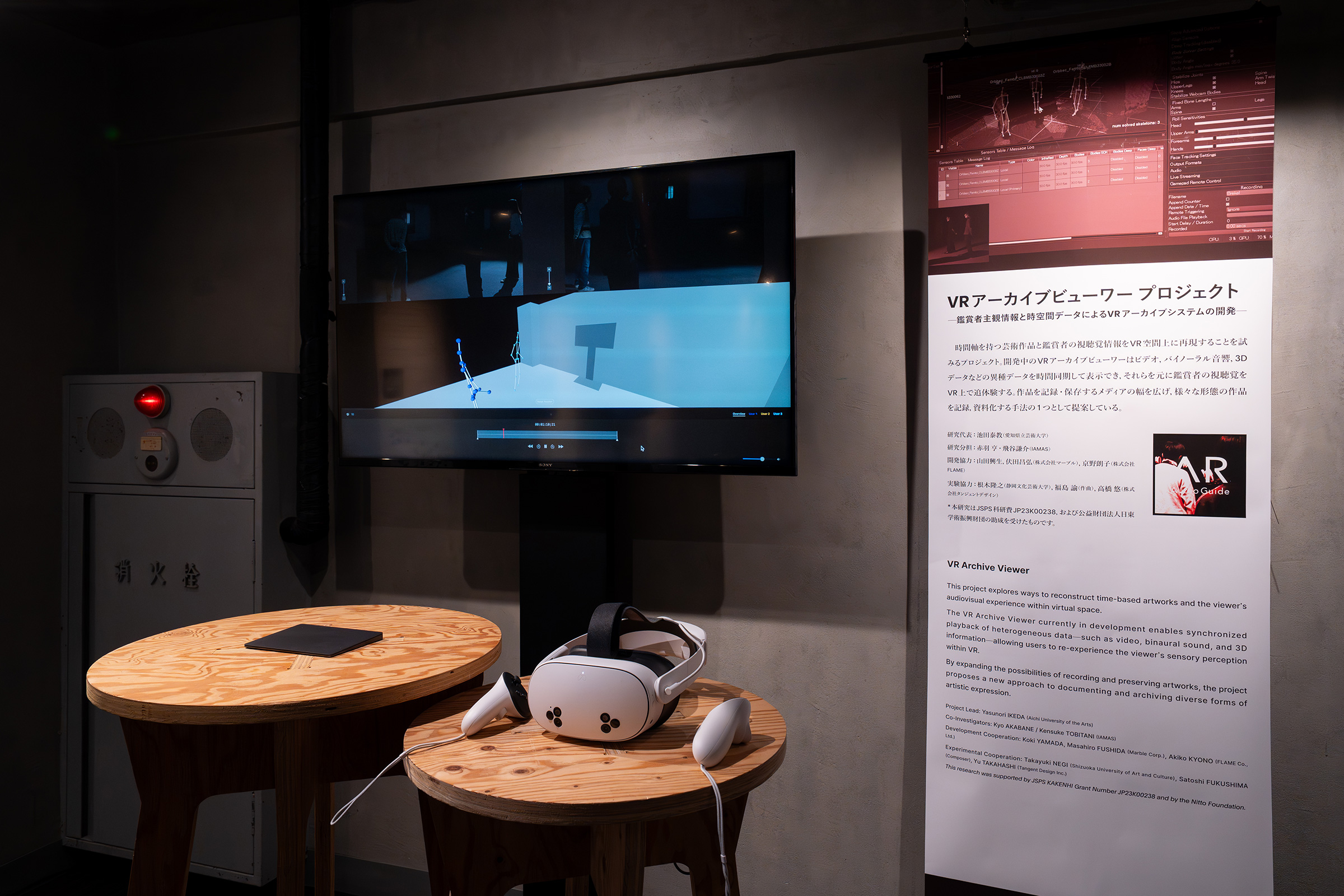 上記2015-17年の研究は、時間的変化の情報が取得可能な高精細3Dスキャンの技術を、展示のアーカイブに応用するというもので、その後の研究手法の土台となった。2019-22年の研究は鑑賞者の主観的な視聴覚体験に着目し、アーカイブの手法とその閲覧システムの開発が目指されていた。今回の研究はこれらをさらに発展させ、鑑賞者が任意の時間に何を見ているか/聴いているかについてそのアーカイブの手法を開発し、それが後年の再制作時に有効な資料として活用されることを目的としている※15。本展ではこの最新の研究の途中経過として、池田泰教による映像作品《BETWEEN YESTERDAY&TOMORROW #03 About the Things May Come to Pass》(2016、オムニバス企画BETWEEN YESTERDAY&TOMORROW参加作品)を題材に、上記のようなVRを使ったアーカイブの閲覧体験ができるようになっていた。最初の研究と異なり、高精細というよりは、例えば作品の持つ時間軸に対して鑑賞者が随時どのような位置で鑑賞していたか、というように、空間・時間・鑑賞者という個々の要素間での相対的な状況把握ができるものであったと思う。