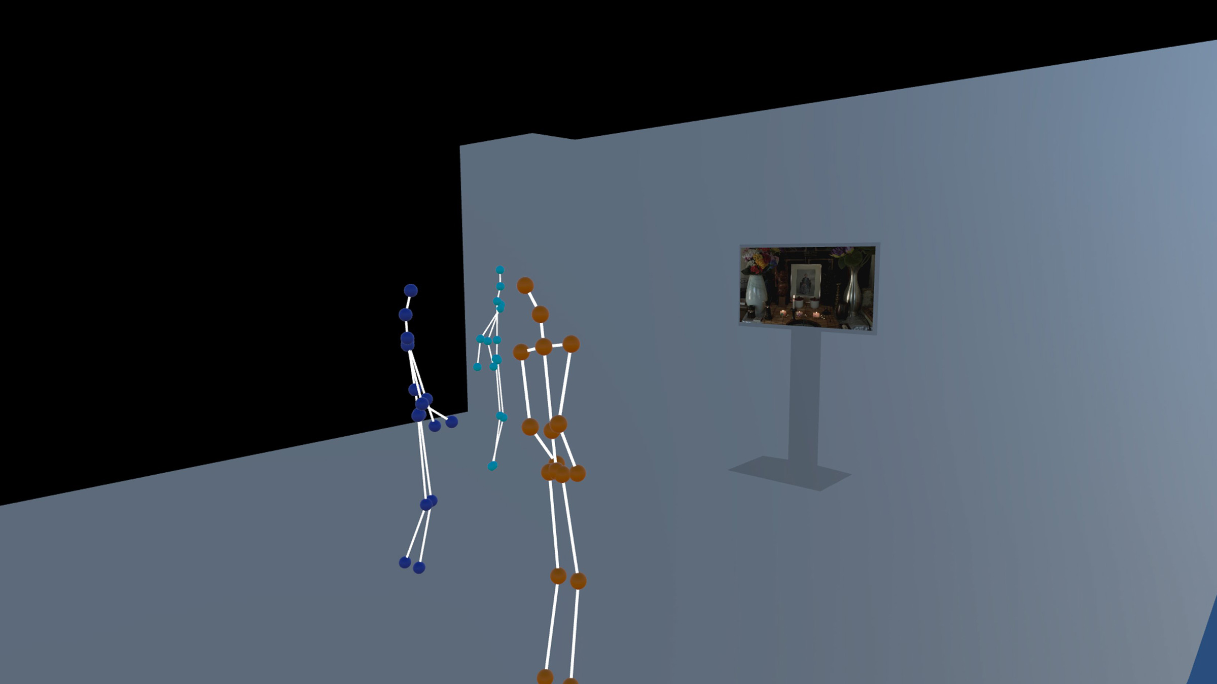 音を扱う一連の展示に隣接する、《RSP》のちょうど対面に当たる壁には池田泰教《VRアーカイブビューワープロジェクト—鑑賞者主観情報と時空間データによるVRアーカイブシステムの開発—》が展開する。これは時間軸を持つ芸術作品を記録し、資料化するためのアーカイブビューワーで、ビデオ、鑑賞者のボーンデータ、作品空間の3Dデータ、音響データといった複数の記録メディアの情報を時間的に統合し、繰り返し閲覧できる、というものだ。会場にはモニター1台と、ヘッドマウント・ディスプレイ、コントローラーが備えられており、VR空間内で過去の鑑賞者のひとりとしてその視点での記録映像を再生したり、コントローラーを使って自由な位置に視点を移動することができる。