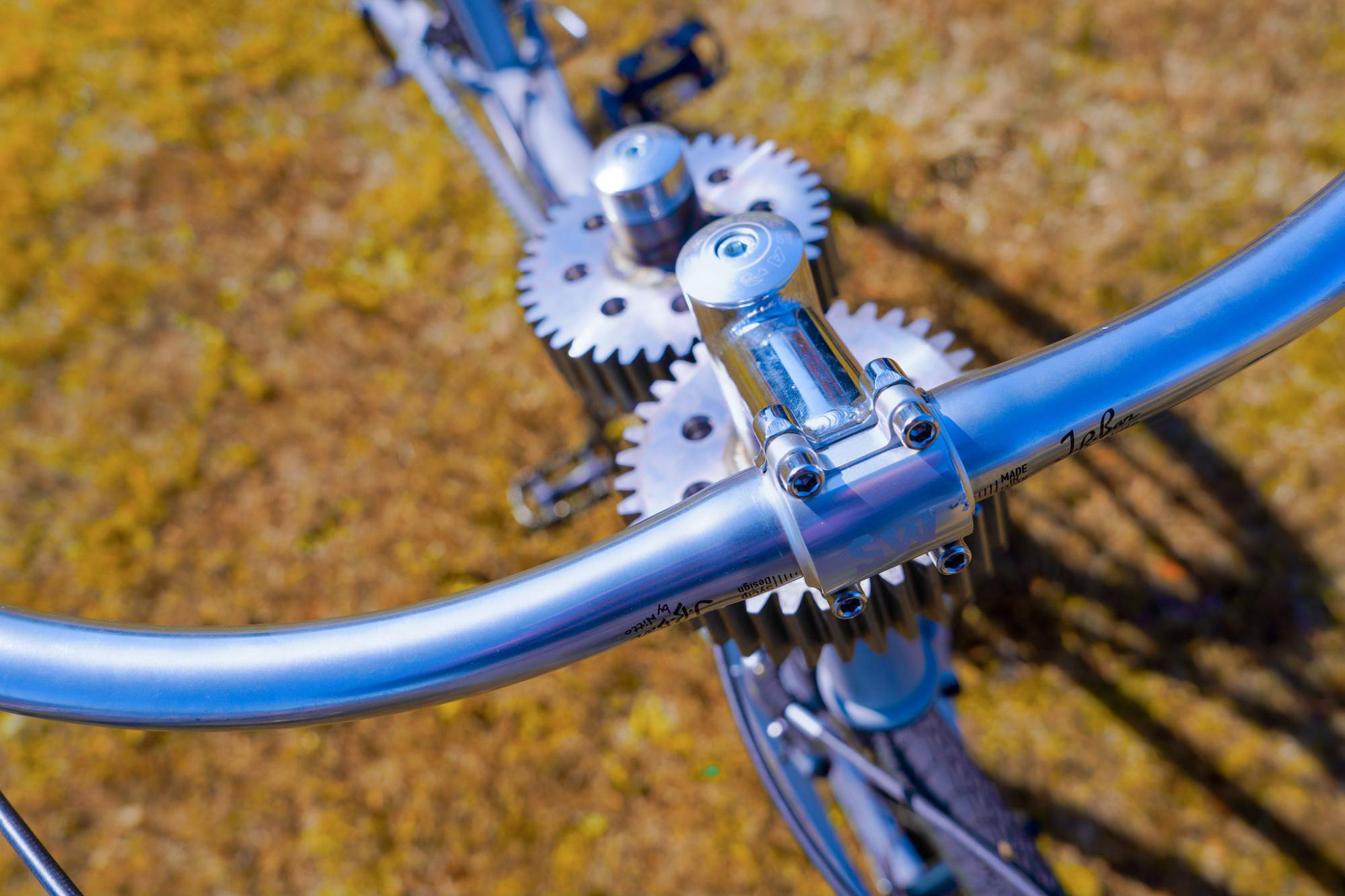 赤松正行教授によるハンドル反転自転車は、ハンドル操作と前輪の向きが逆方向に連動するよう設計されている。ハンドルを右に切ると前輪は左へ、左に切ると右へと向かう構造で、内部の歯車が噛み合うことでハンドル全体が360度回転する仕組みになっている。フレームおよび反転機構の設計・製作は、Shin・服部製作所が担当した。